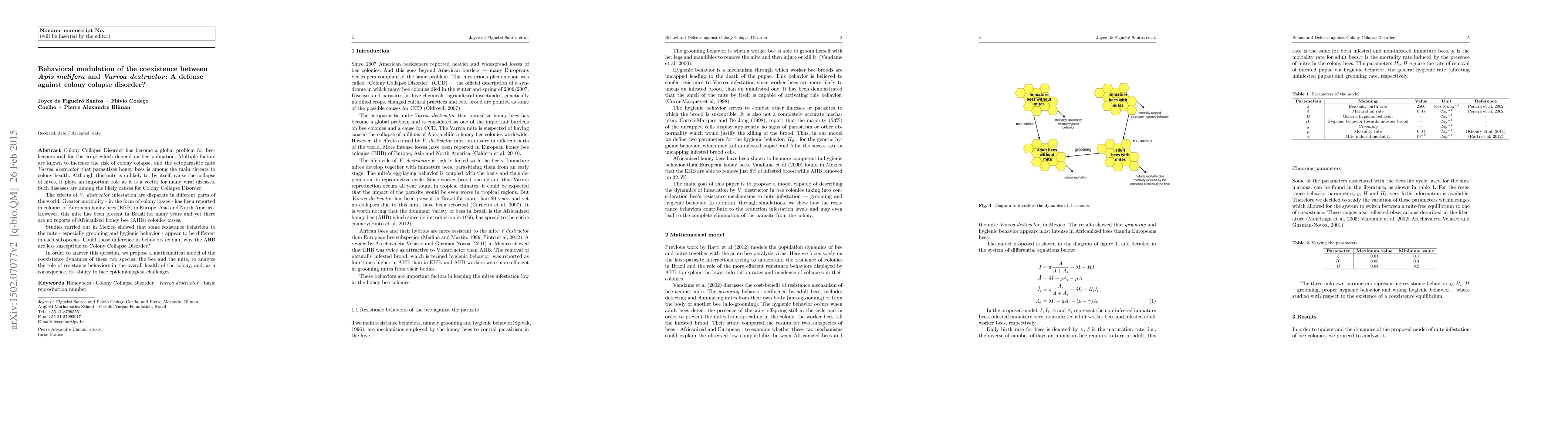 Colony Collapse Disorder has become a global problem for beekeepers and for the crops which depend on bee polination. Multiple factors are known to increase the risk of colony colapse, and the ectoparasitic mite Varroa destructor that parasitizes honey bees is among the main threats to colony health. Although this mite is unlikely to, by itself, cause the collapse of hives, it plays an important role as it is a vector for many viral diseases. Such diseases are among the likely causes for Colony Collapse Disorder. The effects of V. destructor infestation are disparate in different parts of the world. Greater morbidity - in the form of colony losses - has been reported in colonies of European honey bees (EHB) in Europe, Asia and North America. However, this mite has been present in Brasil for many years and yet there are no reports of Africanized honey bee (AHB) colonies losses. Studies carried out in Mexico showed that some resistance behaviors to the mite - especially grooming and hygienic behavior - appear to be different in each subspecies. Could those difference in behaviors explain why the AHB are less susceptible to Colony Collapse Disorder? In order to answer this question, we propose a mathematical model of the coexistence dynamics of these two species, the bee and the mite, to analyze the role of resistance behaviors in the overall health of the colony, and, as a consequence, its ability to face epidemiological challenges.