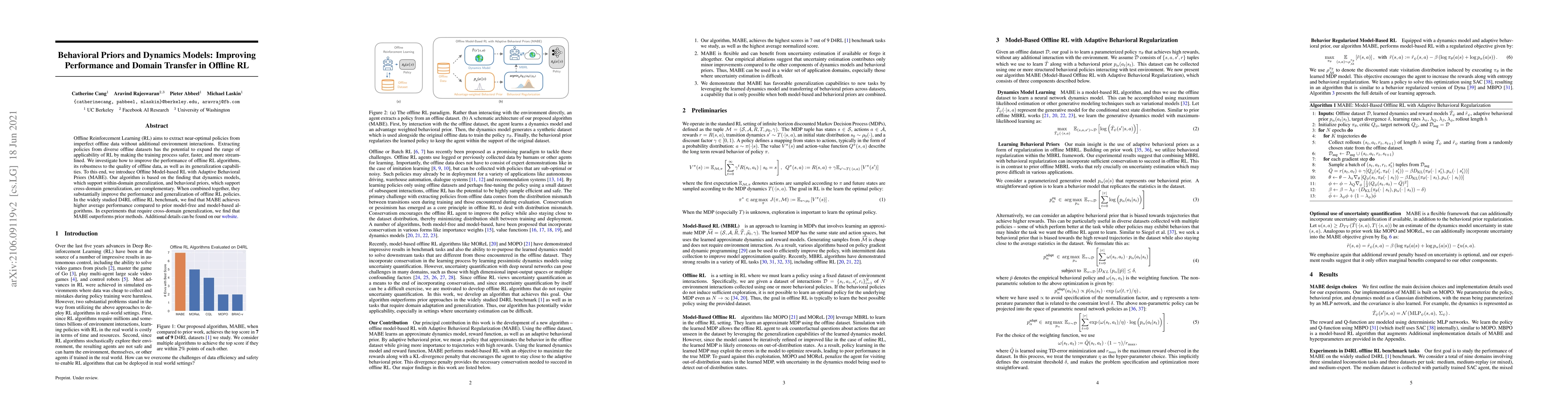 Offline Reinforcement Learning (RL) aims to extract near-optimal policies from imperfect offline data without additional environment interactions. Extracting policies from diverse offline datasets has the potential to expand the range of applicability of RL by making the training process safer, faster, and more streamlined. We investigate how to improve the performance of offline RL algorithms, its robustness to the quality of offline data, as well as its generalization capabilities. To this end, we introduce Offline Model-based RL with Adaptive Behavioral Priors (MABE). Our algorithm is based on the finding that dynamics models, which support within-domain generalization, and behavioral priors, which support cross-domain generalization, are complementary. When combined together, they substantially improve the performance and generalization of offline RL policies. In the widely studied D4RL offline RL benchmark, we find that MABE achieves higher average performance compared to prior model-free and model-based algorithms. In experiments that require cross-domain generalization, we find that MABE outperforms prior methods. Our website is available at https://sites.google.com/berkeley.edu/mabe .