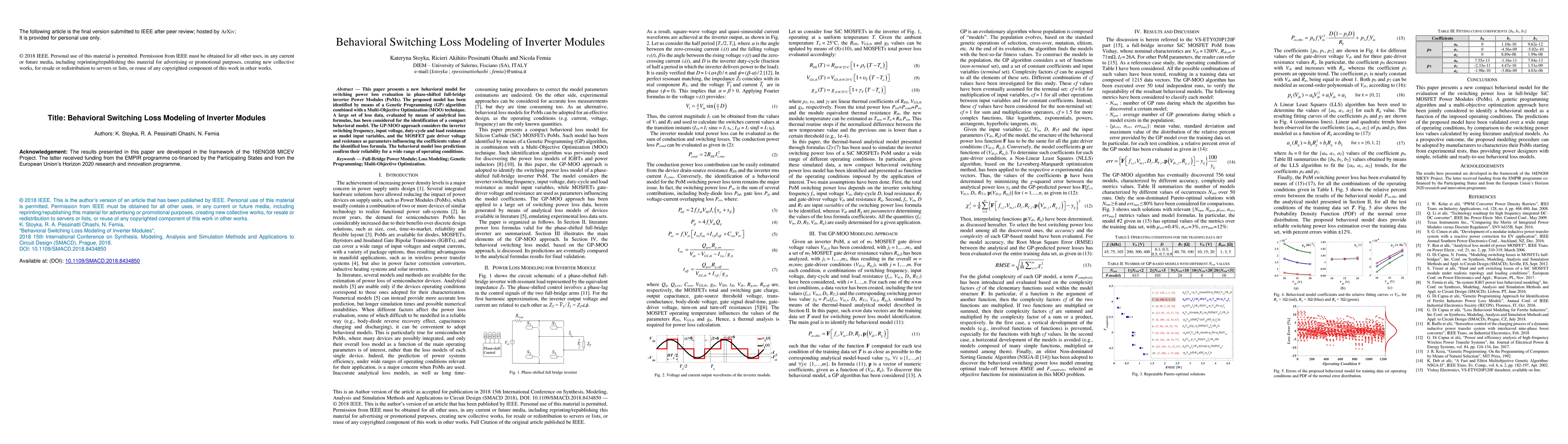 This paper presents a new behavioral model for switching power loss evaluation in phase-shifted full-bridge inverter Power Modules (PoMs). The proposed model has been identified by means of a Genetic Programming (GP) algorithm combined with a Multi-Objective Optimization (MOO) technique. A large set of loss data, evaluated by means of analytical loss formulas, has been considered for the identification of a compact behavioral model. The GP-MOO approach considers the inverter switching frequency, input voltage, duty-cycle and load resistance as model input variables, and the MOSFET gate driver voltage and resistance as parameters influencing the coefficients values of the identified loss formula. The behavioral model loss predictions confirm their reliability for a wide range of operating conditions.