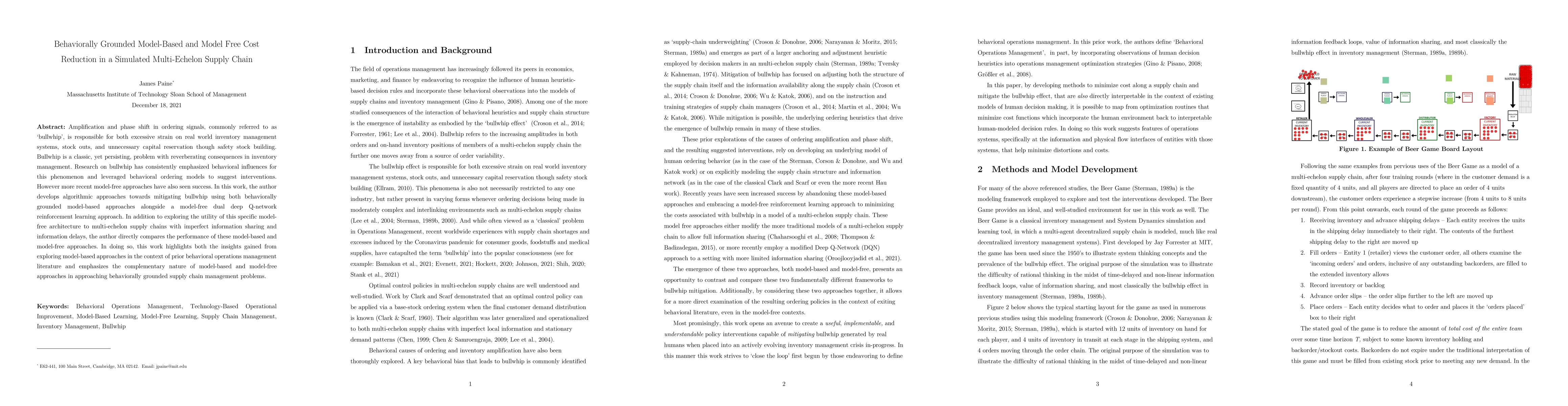 Amplification and phase shift in ordering signals, commonly referred to as bullwhip, are responsible for both excessive strain on real world inventory management systems, stock outs, and unnecessary capital reservation though safety stock building. Bullwhip is a classic, yet persisting, problem with reverberating consequences in inventory management. Research on bullwhip has consistently emphasized behavioral influences for this phenomenon and leveraged behavioral ordering models to suggest interventions. However more recent model-free approaches have also seen success. In this work, the author develops algorithmic approaches towards mitigating bullwhip using both behaviorally grounded model-based approaches alongside a model-free dual deep Q-network reinforcement learning approach. In addition to exploring the utility of this specific model-free architecture to multi-echelon supply chains with imperfect information sharing and information delays, the author directly compares the performance of these model-based and model-free approaches. In doing so, this work highlights both the insights gained from exploring model-based approaches in the context of prior behavioral operations management literature and emphasizes the complementary nature of model-based and model-free approaches in approaching behaviorally grounded supply chain management problems.
