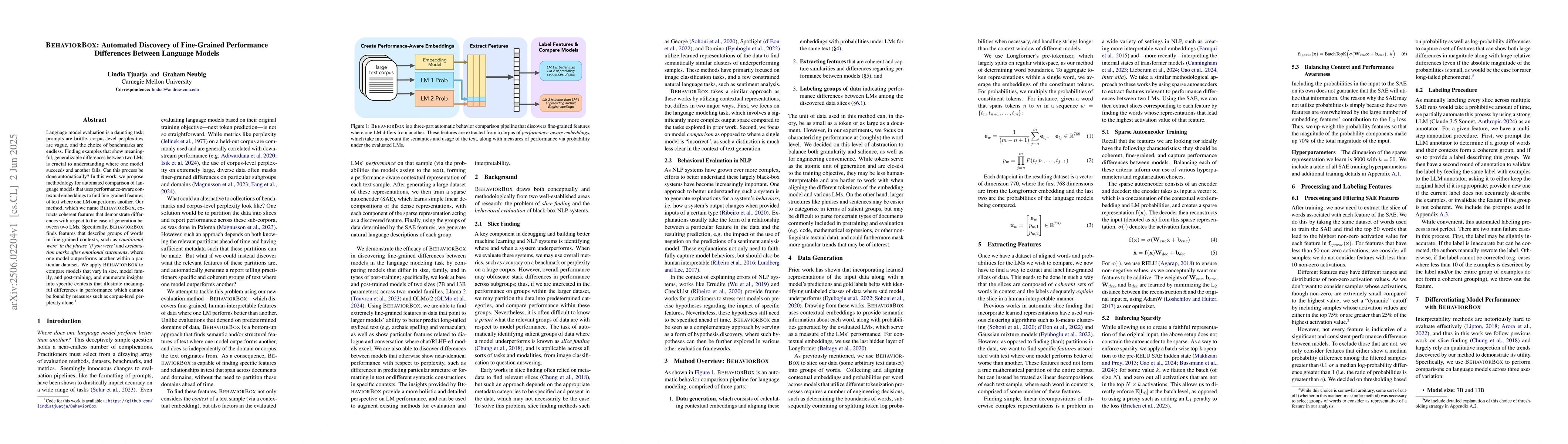 Researchers developed a method called BehaviorBox to automatically compare language models, identifying fine-grained performance differences in specific contexts, such as ease of generation.