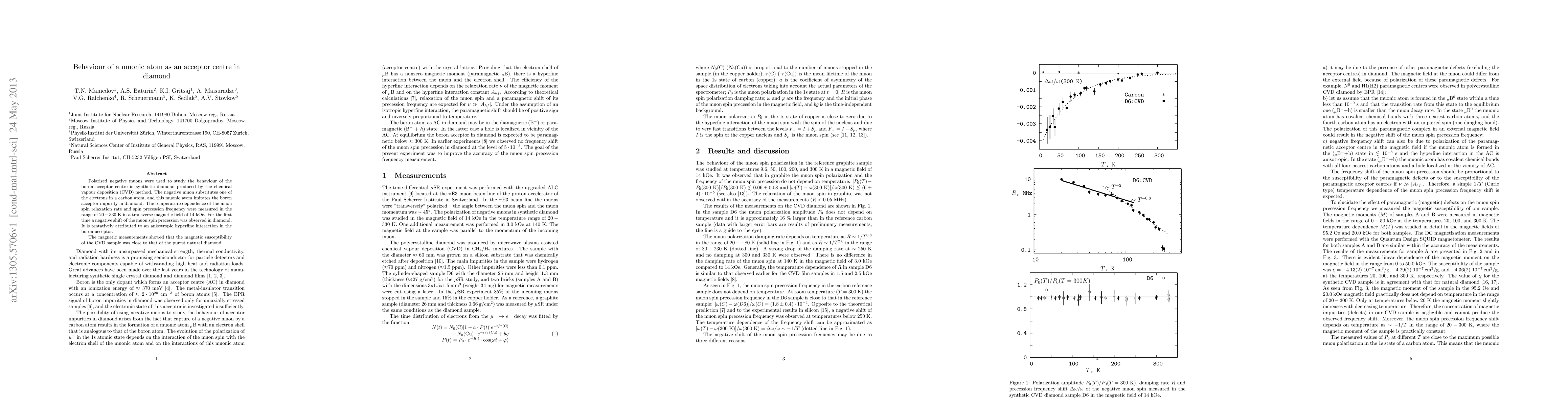Polarized negative muons were used to study the behaviour of the boron acceptor centre in synthetic diamond produced by the chemical vapour deposition (CVD) method. The negative muon substitutes one of the electrons in a carbon atom, and this muonic atom imitates the boron acceptor impurity in diamond. The temperature dependence of the muon spin relaxation rate and spin precession frequency were measured in the range of 20 - 330 K in a transverse magnetic field of 14 kOe. For the first time a negative shift of the muon spin precession was observed in diamond. It is tentatively attributed to an anisotropic hyperfine interaction in the boron acceptor. The magnetic measurements showed that the magnetic susceptibility of the CVD sample was close to that of the purest natural diamond.