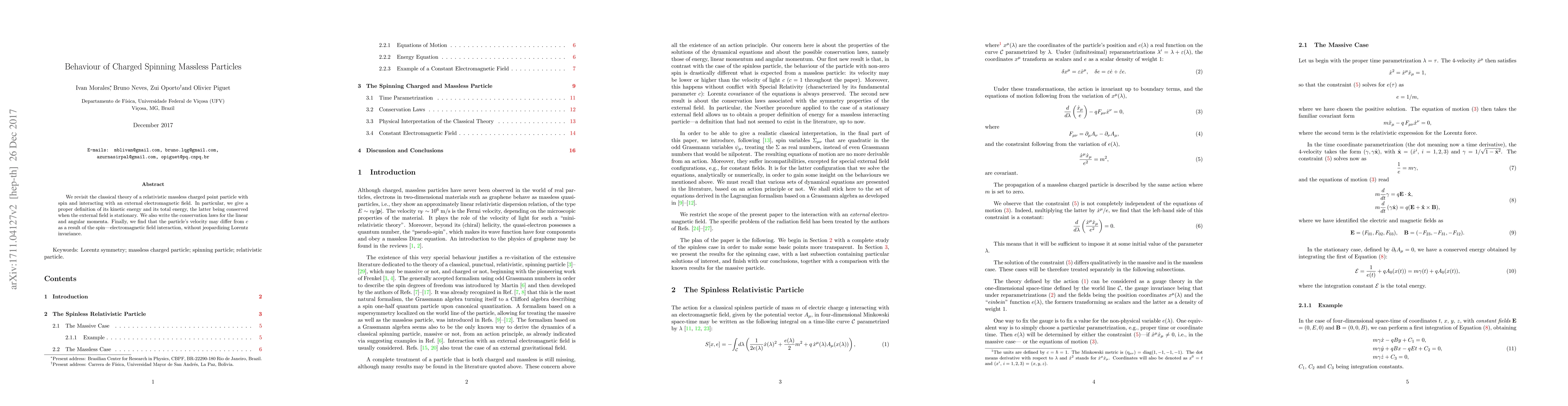 We revisit the classical theory of a relativistic massless charged point particle with spin and interacting with an external electromagnetic field. In particular, we give a proper definition of its kinetic energy and its total energy, the latter being conserved when the external field is stationary. We also write the conservation laws for the linear and angular momenta. Finally, we find that the particle's velocity may differ from $c$ as a result of the spin---electromagnetic field interaction, without jeopardizing Lorentz invariance.