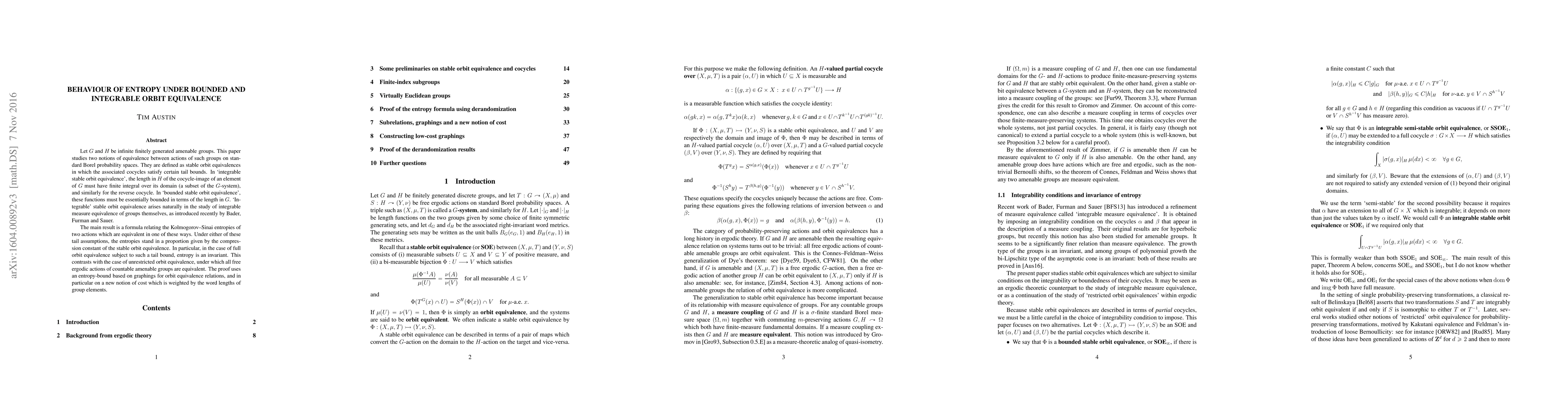 Let $G$ and $H$ be infinite finitely generated amenable groups. This paper studies two notions of equivalence between actions of such groups on standard Borel probability spaces. They are defined as stable orbit equivalences in which the associated cocycles satisfy certain tail bounds. In `integrable stable orbit equivalence', the length in $H$ of the cocycle-image of an element of $G$ must have finite integral over its domain (a subset of the $G$-system), and similarly for the reverse cocycle. In `bounded stable orbit equivalence', these functions must be essentially bounded in terms of the length in $G$. `Integrable' stable orbit equivalence arises naturally in the study of integrable measure equivalence of groups themselves, as introduced recently by Bader, Furman and Sauer. The main result is a formula relating the Kolmogorov--Sinai entropies of two actions which are equivalent in one of these ways. Under either of these tail assumptions, the entropies stand in a proportion given by the compression constant of the stable orbit equivalence. In particular, in the case of full orbit equivalence subject to such a tail bound, entropy is an invariant. This contrasts with the case of unrestricted orbit equivalence, under which all free ergodic actions of countable amenable groups are equivalent. The proof uses an entropy-bound based on graphings for orbit equivalence relations, and in particular on a new notion of cost which is weighted by the word lengths of group elements.