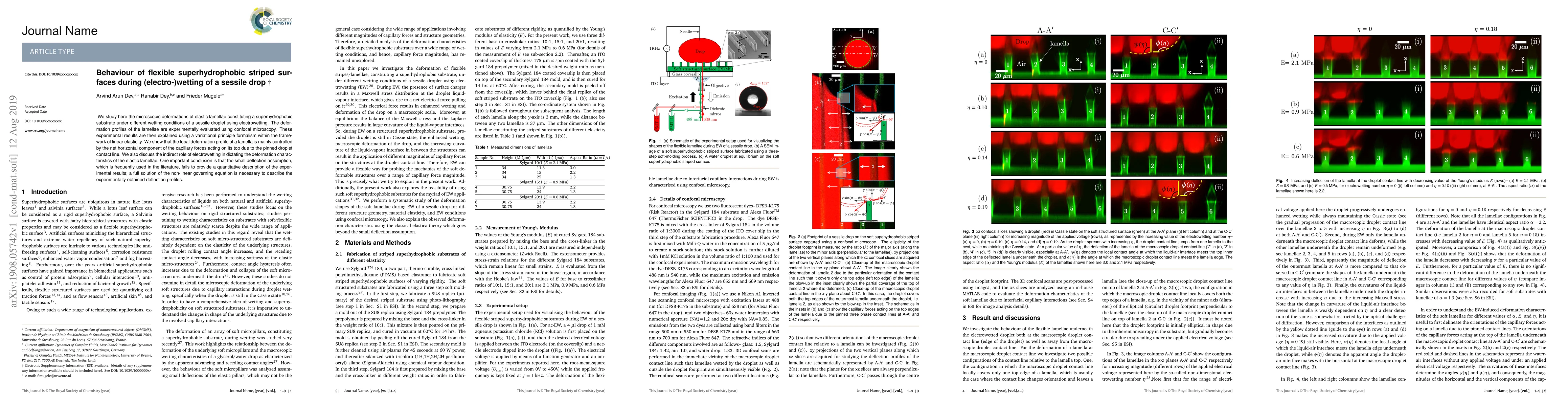 This paper investigates the microscopic deformations of flexible lamellae in superhydrophobic surfaces under electrowetting conditions using confocal microscopy. It concludes that the deformation profiles are primarily controlled by capillary forces and that a full non-linear solution is required to accurately describe the observed deformations, rather than the commonly used small deflection assumption.