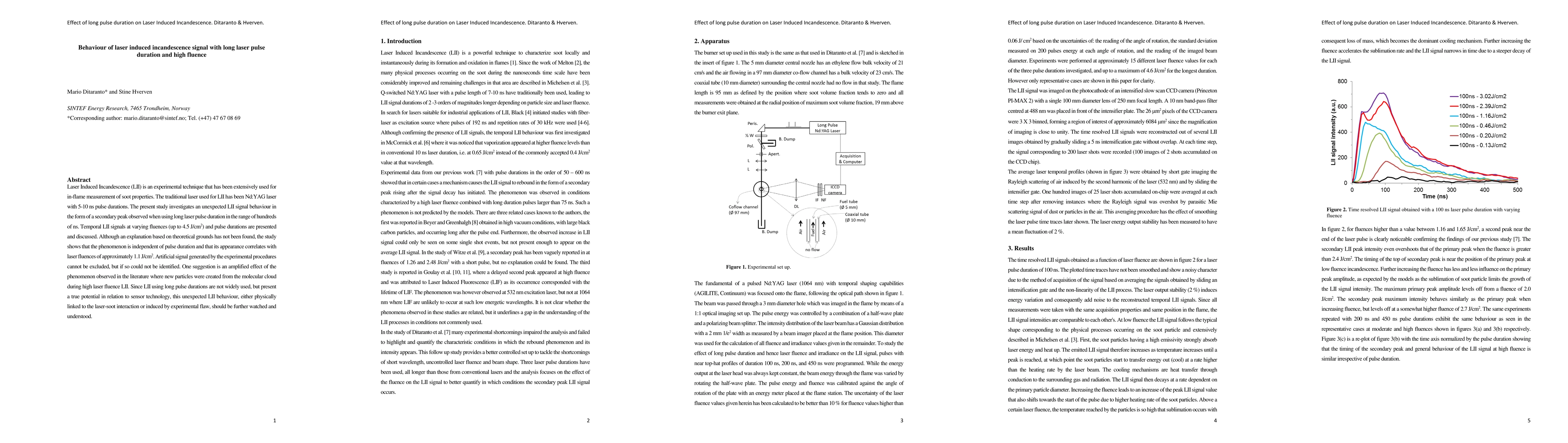 The paper presents a detailed analysis of LII signal behavior with long pulse durations and high fluences, revealing a secondary peak phenomenon that correlates with high laser fluences.