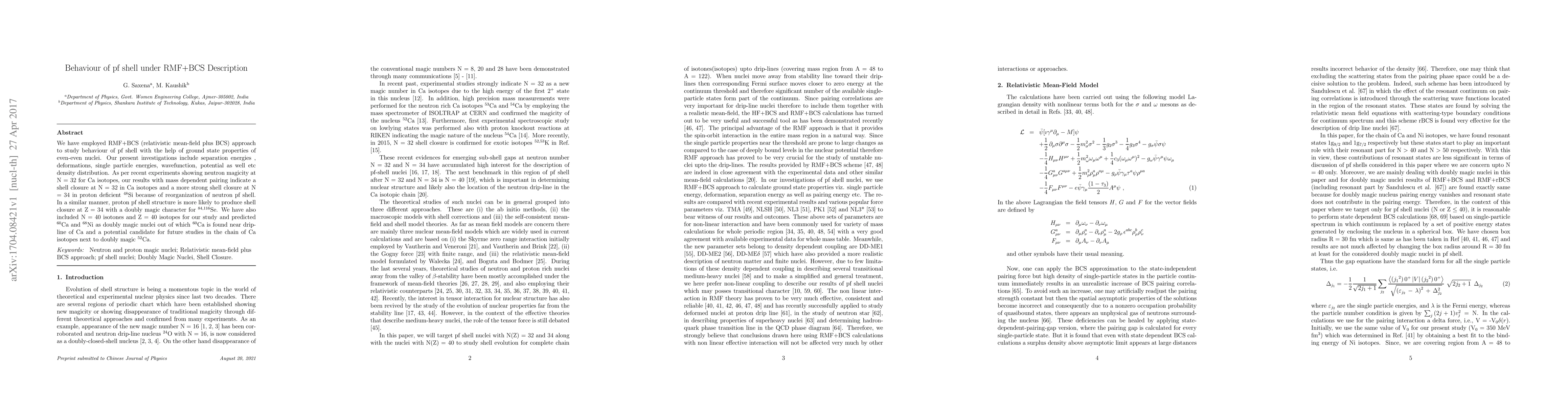 We have employed RMF+BCS (relativistic mean-field plus BCS) approach to study behaviour of pf shell with the help of ground state properties of even-even nuclei. Our present investigations include separation energies , deformations, single particle energies, wavefunction, potential as well etc density distribution. As per recent experiments showing neutron magicity at N = 32 for Ca isotopes, our results with mass dependent pairing indicate a shell closure at N = 32 in Ca isotopes and a more strong shell closure at N = 34 in proton deficient 48Si because of reorganization of neutron pf shell. In a similar manner, proton pf shell structure is more likely to produce shell closure at Z = 34 with a doubly magic character for 84,116Se. We have also included N = 40 isotones and Z = 40 isotopes for our study and predicted 60Ca and 68Ni as doubly magic nuclei out of which 60Ca is found near dripline of Ca and a potential candidate for future studies in the chain of Ca isotopes next to doubly magic 52Ca.