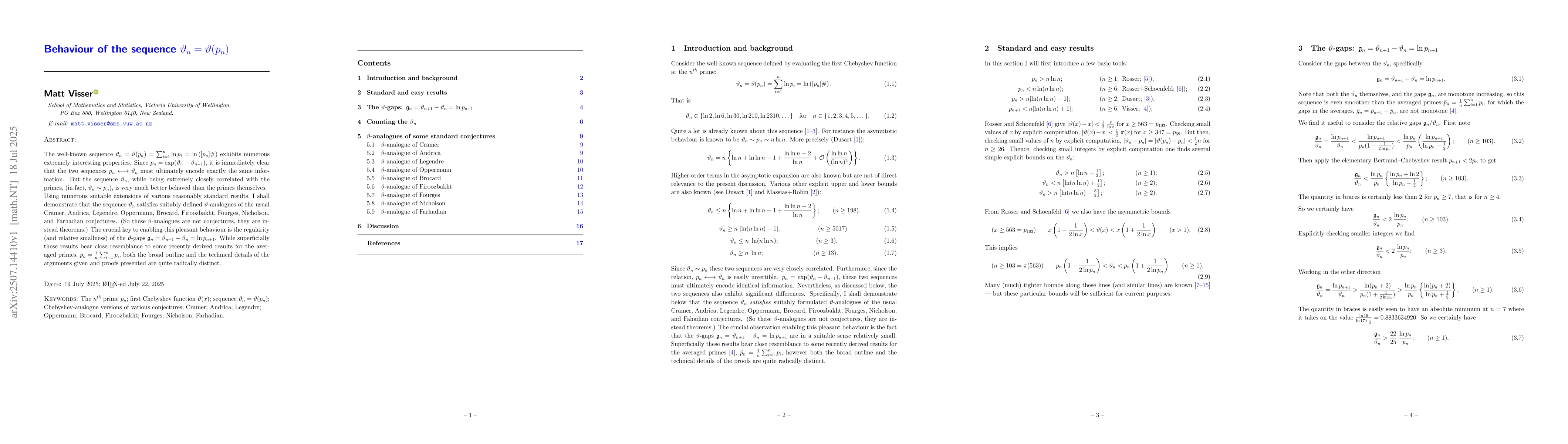 The well-known sequence $\vartheta_n = \vartheta(p_n) = \sum_{i=1}^n \ln p_i= \ln\left([p_n]\#\right)$ exhibits numerous extremely interesting properties. Since $p_n = \exp(\vartheta_n - \vartheta_{n-1})$, it is immediately clear that the two sequences $p_n \longleftrightarrow \vartheta_n$ must ultimately encode exactly the same information. But the sequence $\vartheta_n$, while being extremely closely correlated with the primes, (in fact, $\vartheta_n \sim p_n$), is very much better behaved than the primes themselves. Using numerous suitable extensions of various reasonably standard results, I shall demonstrate that the sequence $\vartheta_n$ satisfies suitably defined $\vartheta$-analogues of the usual Cramer, Andrica, Legendre, Oppermann, Brocard, Firoozbakht, Fourges, Nicholson, and Farhadian conjectures. (So these $\vartheta$-analogues are not conjectures, they are instead theorems.) The crucial key to enabling this pleasant behaviour is the regularity (and relative smallness) of the $\theta$-gaps $\mathfrak{g}_n = \vartheta_{n+1}-\vartheta_n= \ln p_{n+1}$. While superficially these results bear close resemblance to some recently derived results for the averaged primes, $\bar p_n = {1\over n} \sum_{i=1}^n p_i$, both the broad outline and the technical details of the arguments given and proofs presented are quite radically distinct.