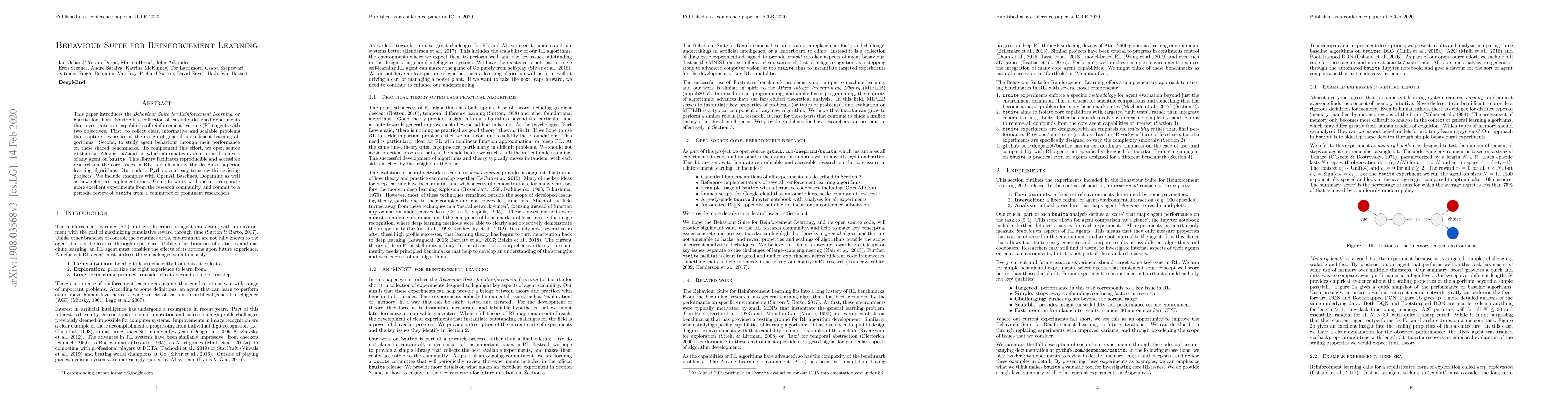 This paper introduces bsuite, a collection of experiments to evaluate reinforcement learning agents, focusing on scalable, informative problems to advance general and efficient learning algorithms. The open-source library facilitates reproducible research and includes examples with popular RL frameworks.