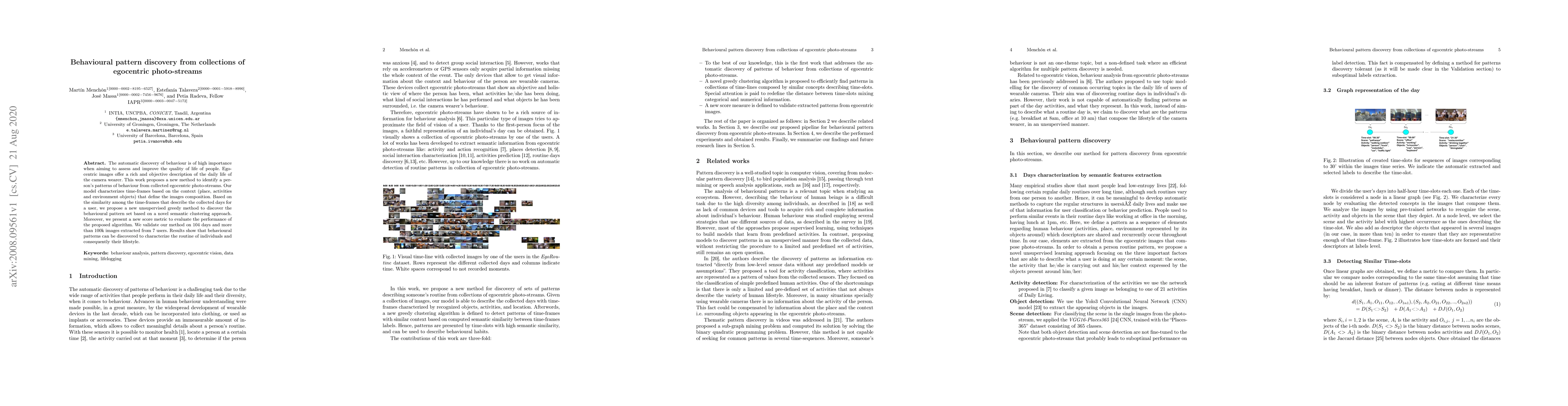 The automatic discovery of behaviour is of high importance when aiming to assess and improve the quality of life of people. Egocentric images offer a rich and objective description of the daily life of the camera wearer. This work proposes a new method to identify a person's patterns of behaviour from collected egocentric photo-streams. Our model characterizes time-frames based on the context (place, activities and environment objects) that define the images composition. Based on the similarity among the time-frames that describe the collected days for a user, we propose a new unsupervised greedy method to discover the behavioural pattern set based on a novel semantic clustering approach. Moreover, we present a new score metric to evaluate the performance of the proposed algorithm. We validate our method on 104 days and more than 100k images extracted from 7 users. Results show that behavioural patterns can be discovered to characterize the routine of individuals and consequently their lifestyle.