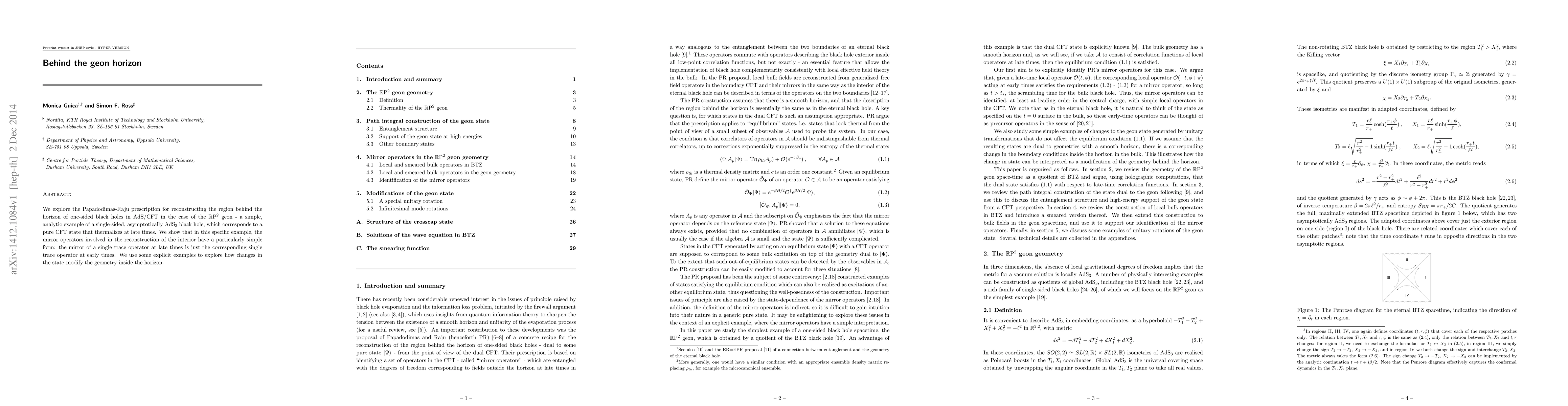 We explore the Papadodimas-Raju prescription for reconstructing the region behind the horizon of one-sided black holes in AdS/CFT in the case of the RP^2 geon - a simple, analytic example of a single-sided, asymptotically AdS_3 black hole, which corresponds to a pure CFT state that thermalises at late times. We show that in this specific example, the mirror operators involved in the reconstruction of the interior have a particularly simple form: the mirror of a single trace operator at late times is just the corresponding single trace operator at early times. We use some explicit examples to explore how changes in the state modify the geometry inside the horizon.