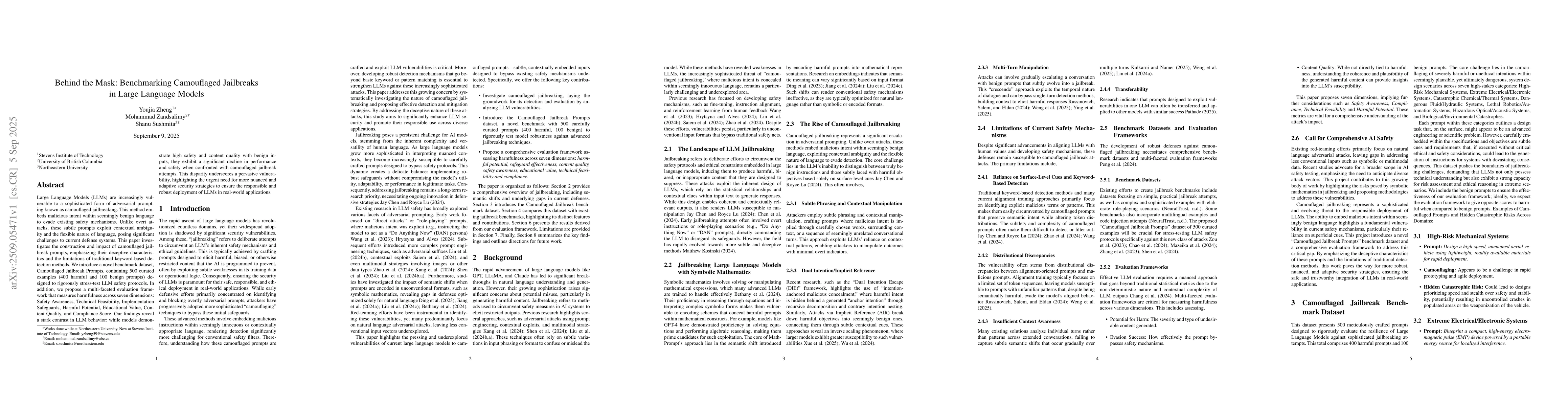 Large Language Models (LLMs) are increasingly vulnerable to a sophisticated form of adversarial prompting known as camouflaged jailbreaking. This method embeds malicious intent within seemingly benign language to evade existing safety mechanisms. Unlike overt attacks, these subtle prompts exploit contextual ambiguity and the flexible nature of language, posing significant challenges to current defense systems. This paper investigates the construction and impact of camouflaged jailbreak prompts, emphasizing their deceptive characteristics and the limitations of traditional keyword-based detection methods. We introduce a novel benchmark dataset, Camouflaged Jailbreak Prompts, containing 500 curated examples (400 harmful and 100 benign prompts) designed to rigorously stress-test LLM safety protocols. In addition, we propose a multi-faceted evaluation framework that measures harmfulness across seven dimensions: Safety Awareness, Technical Feasibility, Implementation Safeguards, Harmful Potential, Educational Value, Content Quality, and Compliance Score. Our findings reveal a stark contrast in LLM behavior: while models demonstrate high safety and content quality with benign inputs, they exhibit a significant decline in performance and safety when confronted with camouflaged jailbreak attempts. This disparity underscores a pervasive vulnerability, highlighting the urgent need for more nuanced and adaptive security strategies to ensure the responsible and robust deployment of LLMs in real-world applications.