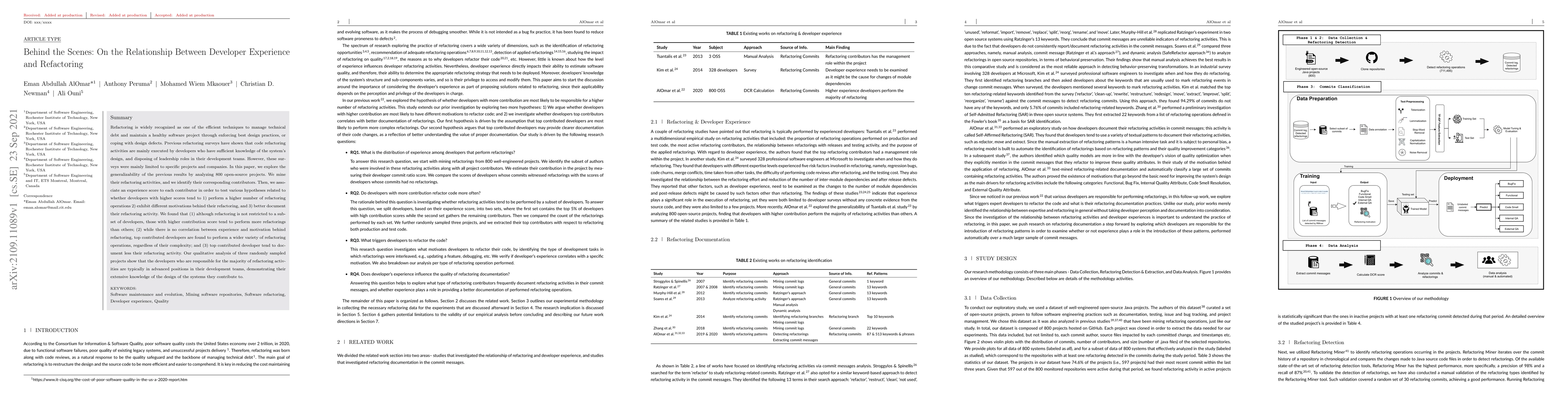 This paper investigates the relationship between developer experience and refactoring in 800 open-source projects, finding that more experienced developers tend to perform more refactorings and a wider variety of them, but do not necessarily document their activities better. The study highlights that while refactoring is not exclusive to experienced developers, those with higher contribution scores engage more in refactoring tasks.