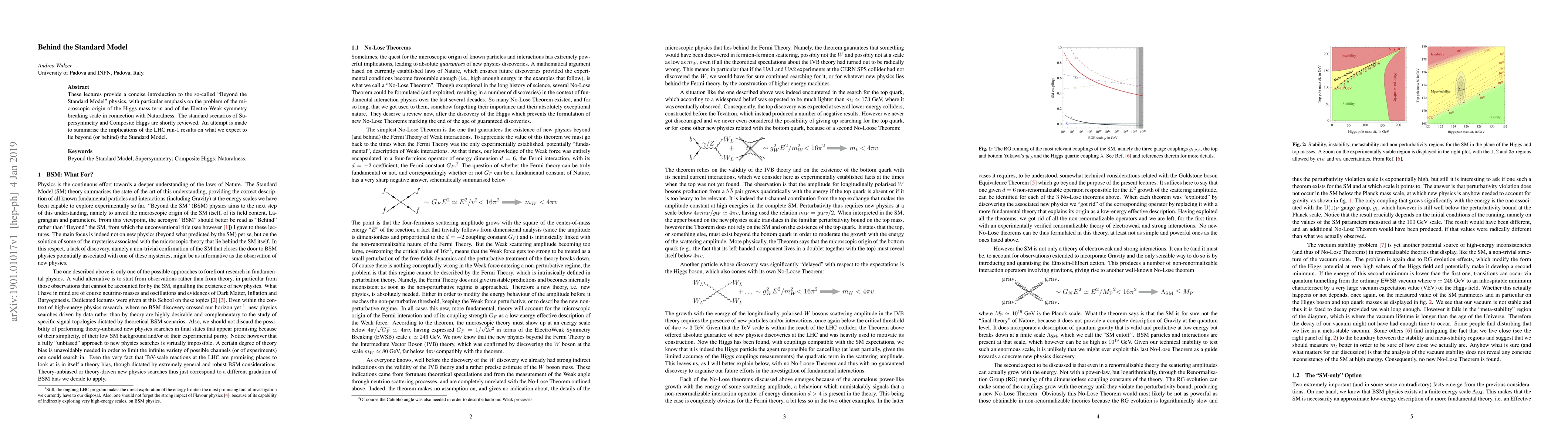 These lectures provide a concise introduction to the so-called "Beyond the Standard Model"' physics, with particular emphasis on the problem of the microscopic origin of the Higgs mass term and of the Electro-Weak symmetry breaking scale in connection with Naturalness. The standard scenarios of Supersymmetry and Composite Higgs are shortly reviewed. An attempt is made to summarise the implications of the LHC run-$1$ results on what we expect to lie beyond (or behind) the Standard Model.