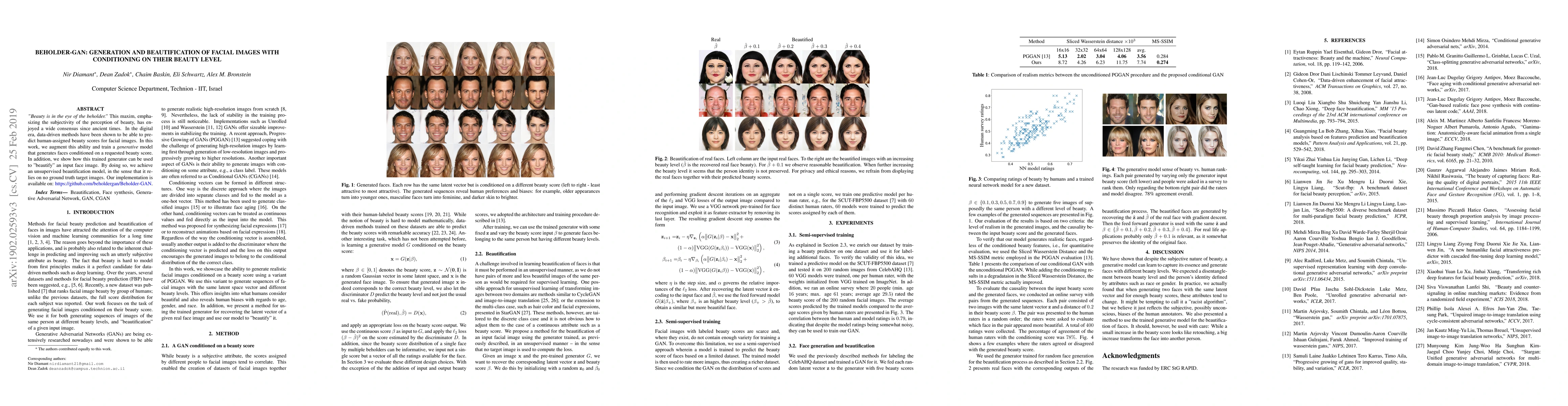 Summary: This paper introduces Beholder-GAN, a generative model that creates facial images based on specified beauty scores and can enhance the beauty of input faces without requiring target images for training. It leverages data-driven beauty perception to achieve unsupervised beautification.