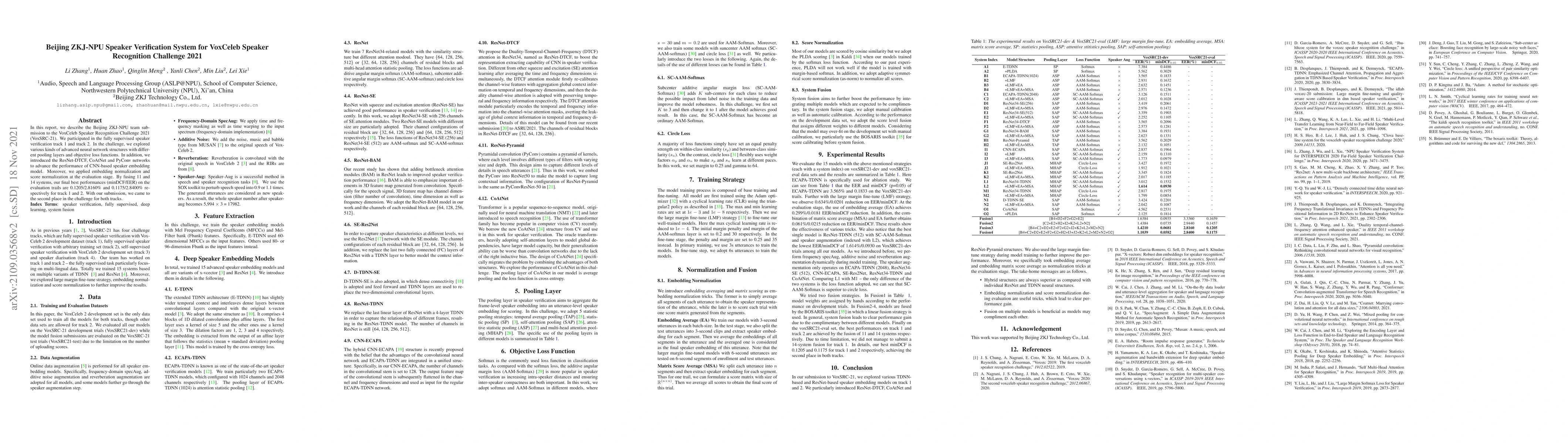 In this report, we describe the Beijing ZKJ-NPU team submission to the VoxCeleb Speaker Recognition Challenge 2021 (VoxSRC-21). We participated in the fully supervised speaker verification track 1 and track 2. In the challenge, we explored various kinds of advanced neural network structures with different pooling layers and objective loss functions. In addition, we introduced the ResNet-DTCF, CoAtNet and PyConv networks to advance the performance of CNN-based speaker embedding model. Moreover, we applied embedding normalization and score normalization at the evaluation stage. By fusing 11 and 14 systems, our final best performances (minDCF/EER) on the evaluation trails are 0.1205/2.8160% and 0.1175/2.8400% respectively for track 1 and 2. With our submission, we came to the second place in the challenge for both tracks.