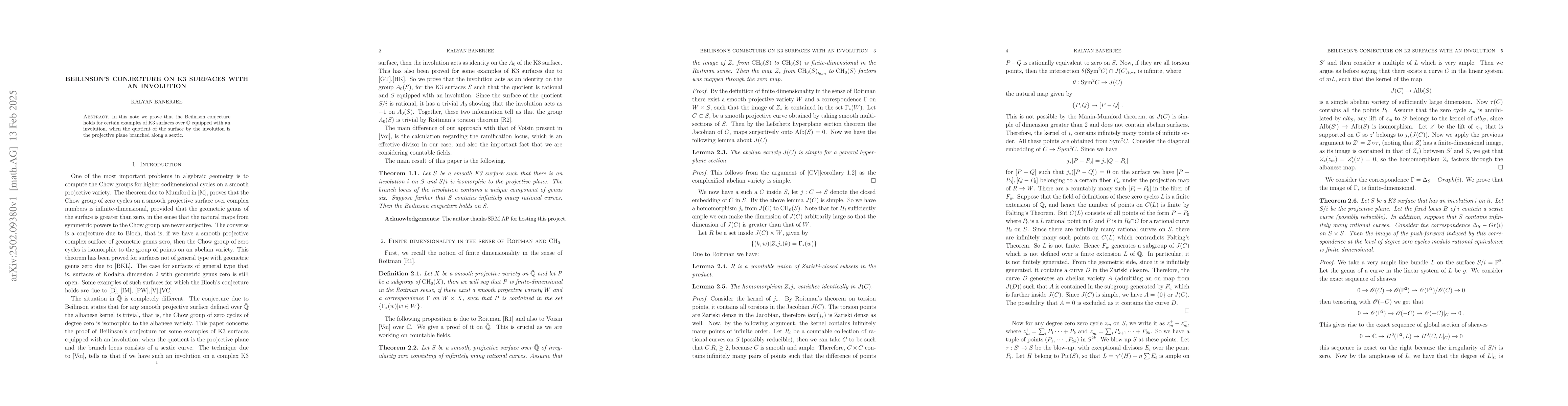 The paper establishes a proof for Beilinson's conjecture on K3 surfaces with an involution, utilizing properties of algebraic cycles and the Roitman's finite-dimensionality criterion.