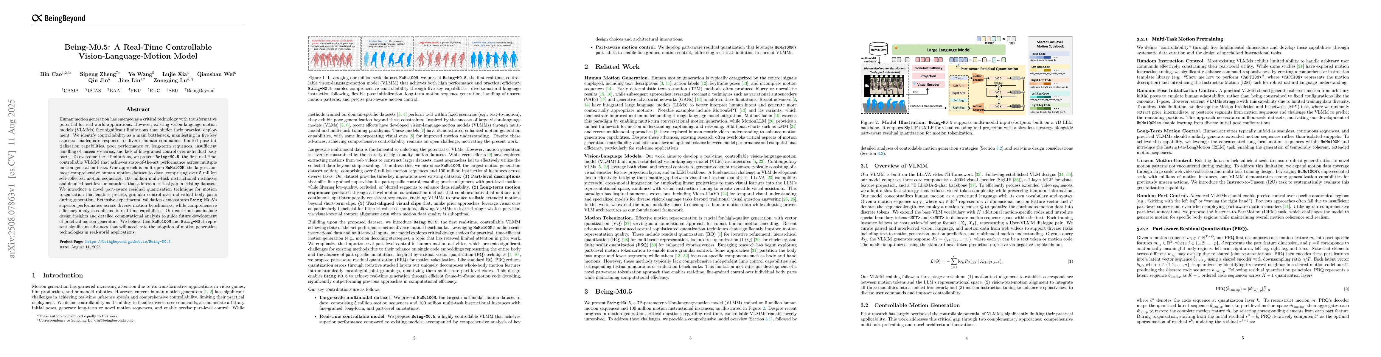 The research presents Being-M0.5, a real-time controllable Vision-Language-Motion Model (VLMM) built on HuMo100M, the largest human motion dataset with over 5 million sequences and 100 million instructional instances. It introduces a part-aware residual quantization (PRQ) technique for precise control over individual body parts.