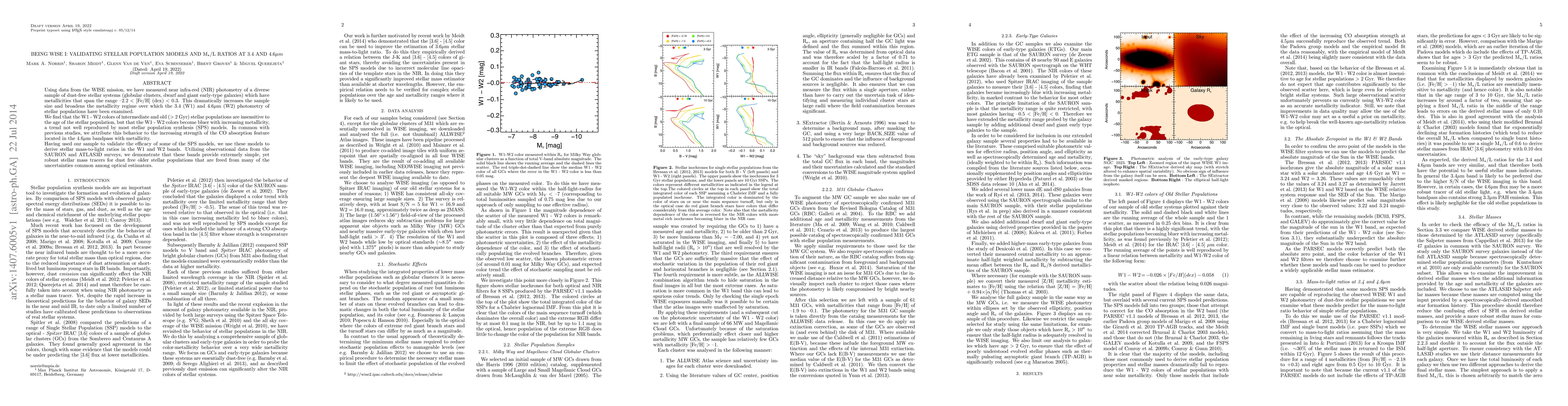 Using data from the WISE mission, we have measured near infra-red (NIR) photometry of a diverse sample of dust-free stellar systems (globular clusters, dwarf and giant early-type galaxies) which have metallicities that span the range -2.2 < [Fe/H] (dex) < 0.3. This dramatically increases the sample size and broadens the metallicity regime over which the 3.4 (W1) and 4.6 micron (W2) photometry of stellar populations have been examined. We find that the W1 - W2 colors of intermediate and old (> 2 Gyr) stellar populations are insensitive to the age of the stellar population, but that the W1 - W2 colors become bluer with increasing metallicity, a trend not well reproduced by most stellar population synthesis (SPS) models. In common with previous studies, we attribute this behavior to the increasing strength of the CO absorption feature located in the 4.6 micron bandpass with metallicity. Having used our sample to validate the efficacy of some of the SPS models, we use these models to derive stellar mass-to-light ratios in the W1 and W2 bands. Utilizing observational data from the SAURON and ATLAS3D surveys, we demonstrate that these bands provide extremely simple, yet robust stellar mass tracers for dust free older stellar populations that are freed from many of the uncertainties common among optical estimators.