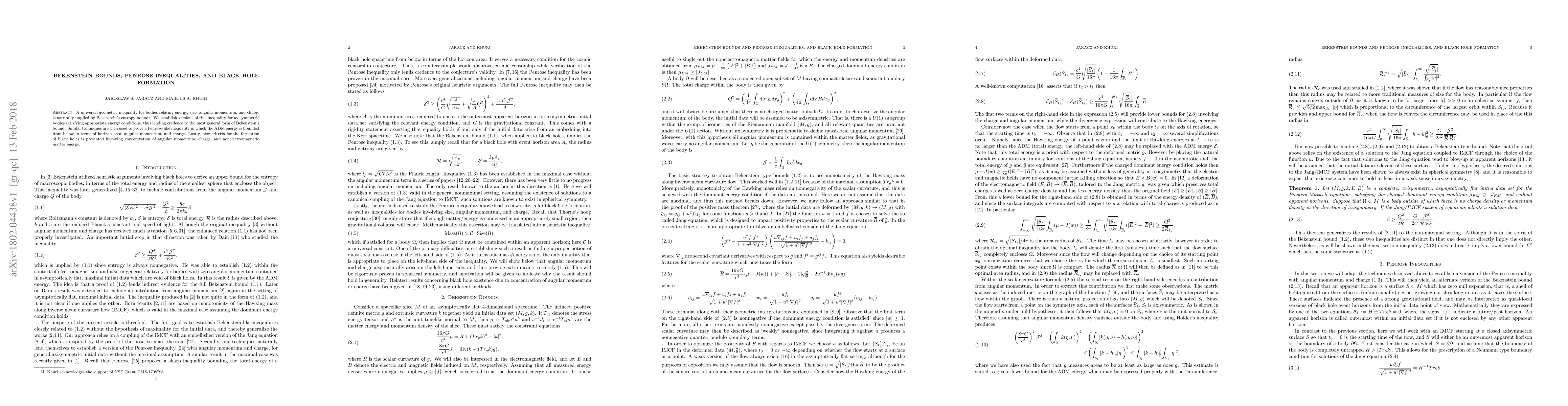 This paper establishes geometric inequalities for axisymmetric bodies, supporting Bekenstein's entropy bounds and proving a Penrose-like inequality. It also introduces new criteria for black hole formation based on angular momentum, charge, and nonelectromagnetic matter energy.