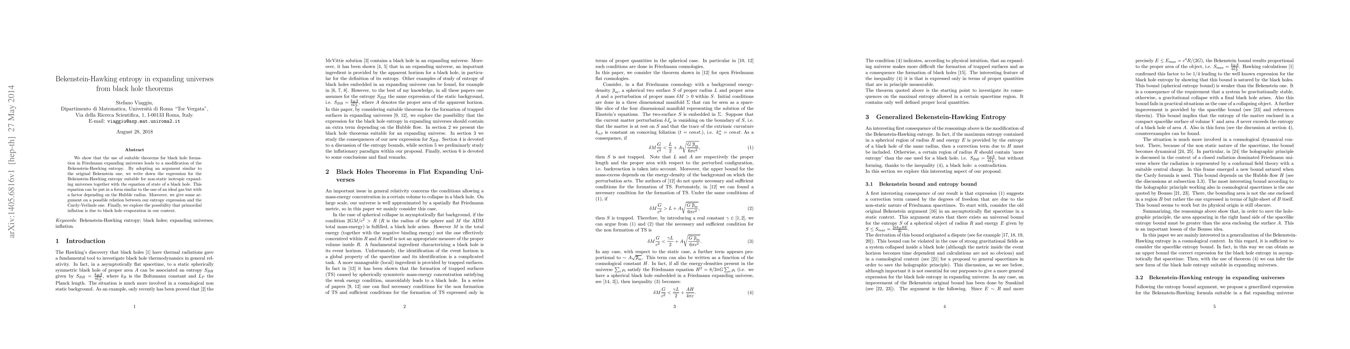 We show that the use of suitable theorems for black hole formation in Friedmann expanding universes leads to a modification of the Bekenstein-Hawking entropy. By adopting an argument similar to the original Bekenstein one, we write down the expression for the Bekenstein-Hawking entropy suitable for non-static isotropic expanding universes together with the equation of state of a black hole. This equation can be put in a form similar to the one of an ideal gas but with a factor depending on the Hubble radius. Moreover, we give some argument on a possible relation between our entropy expression and the Cardy-Verlinde one. Finally, we explore the possibility that primordial inflation is due to black hole evaporation in our context.