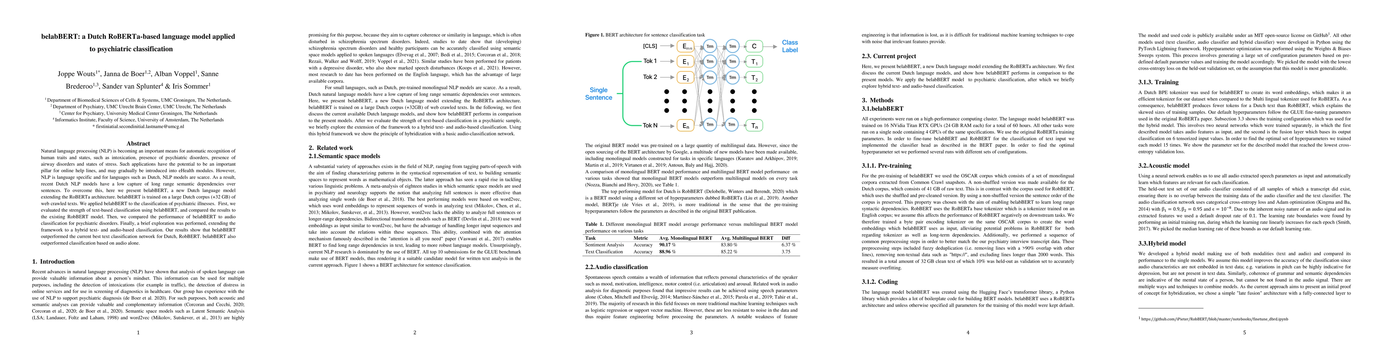 Natural language processing (NLP) is becoming an important means for automatic recognition of human traits and states, such as intoxication, presence of psychiatric disorders, presence of airway disorders and states of stress. Such applications have the potential to be an important pillar for online help lines, and may gradually be introduced into eHealth modules. However, NLP is language specific and for languages such as Dutch, NLP models are scarce. As a result, recent Dutch NLP models have a low capture of long range semantic dependencies over sentences. To overcome this, here we present belabBERT, a new Dutch language model extending the RoBERTa architecture. belabBERT is trained on a large Dutch corpus (+32 GB) of web crawled texts. We applied belabBERT to the classification of psychiatric illnesses. First, we evaluated the strength of text-based classification using belabBERT, and compared the results to the existing RobBERT model. Then, we compared the performance of belabBERT to audio classification for psychiatric disorders. Finally, a brief exploration was performed, extending the framework to a hybrid text- and audio-based classification. Our results show that belabBERT outperformed the current best text classification network for Dutch, RobBERT. belabBERT also outperformed classification based on audio alone.