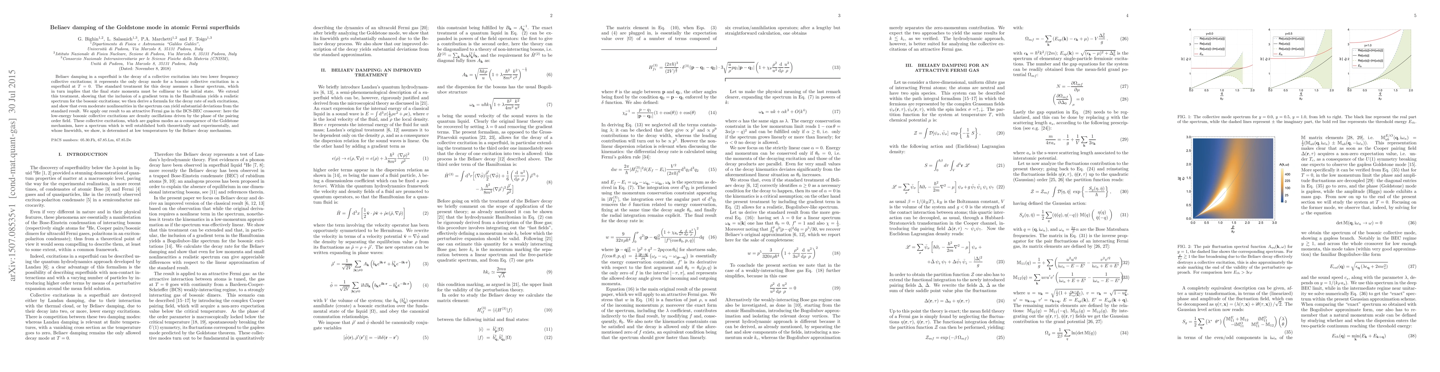 Beliaev damping in a superfluid is the decay of a collective excitation into two lower frequency collective excitations; it represents the only decay mode for a bosonic collective excitation in a superfluid at T = 0. The standard treatment for this decay assumes a linear spectrum, which in turn implies that the final state momenta must be collinear to the initial state. We extend this treatment, showing that the inclusion of a gradient term in the Hamiltonian yields a realistic spectrum for the bosonic excitations; we then derive a formula for the decay rate of such excitations, and show that even moderate nonlinearities in the spectrum can yield substantial deviations from the standard result. We apply our result to an attractive Fermi gas in the BCS-BEC crossover: here the low-energy bosonic collective excitations are density oscillations driven by the phase of the pairing order field. These collective excitations, which are gapless modes as a consequence of the Goldstone mechanism, have a spectrum which is well established both theoretically and experimentally, and whose linewidth, we show, is determined at low temperatures by the Beliaev decay mechanism.