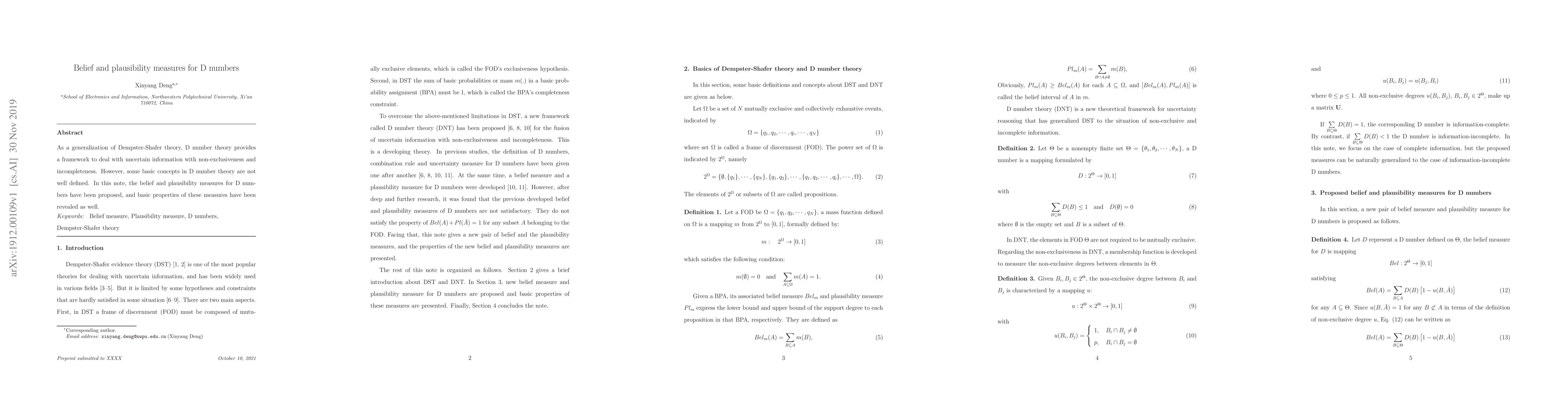 This paper proposes belief and plausibility measures for D numbers, a generalization of Dempster-Shafer theory, to address uncertainties involving non-exclusiveness and incompleteness, and explores their fundamental properties.
