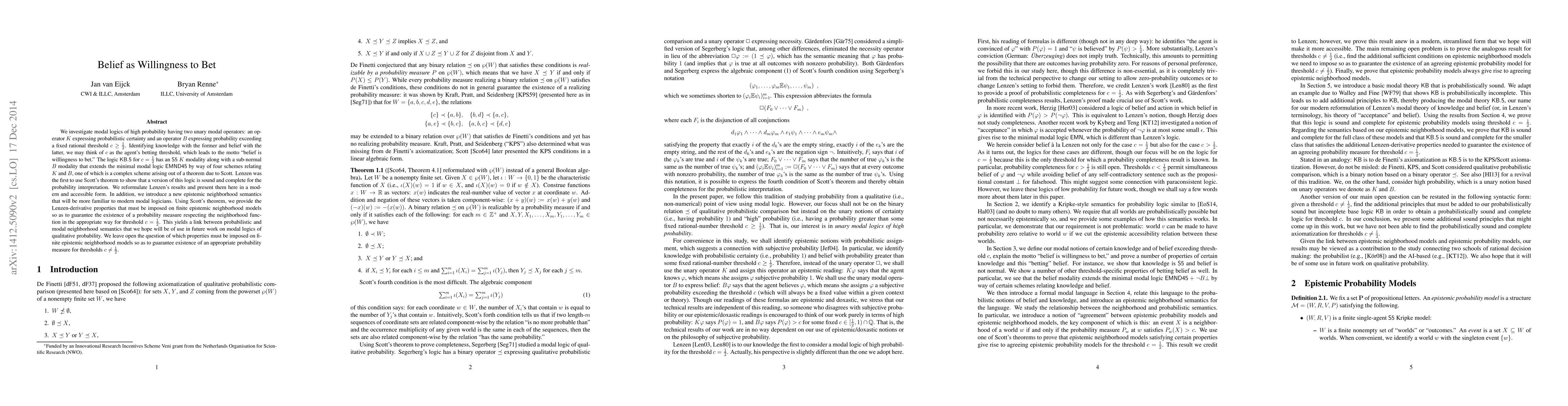 We investigate modal logics of high probability having two unary modal operators: an operator $K$ expressing probabilistic certainty and an operator $B$ expressing probability exceeding a fixed rational threshold $c\geq\frac 12$. Identifying knowledge with the former and belief with the latter, we may think of $c$ as the agent's betting threshold, which leads to the motto "belief is willingness to bet." The logic $\mathsf{KB.5}$ for $c=\frac 12$ has an $\mathsf{S5}$ $K$ modality along with a sub-normal $B$ modality that extends the minimal modal logic $\mathsf{EMND45}$ by way of four schemes relating $K$ and $B$, one of which is a complex scheme arising out of a theorem due to Scott. Lenzen was the first to use Scott's theorem to show that a version of this logic is sound and complete for the probability interpretation. We reformulate Lenzen's results and present them here in a modern and accessible form. In addition, we introduce a new epistemic neighborhood semantics that will be more familiar to modern modal logicians. Using Scott's theorem, we provide the Lenzen-derivative properties that must be imposed on finite epistemic neighborhood models so as to guarantee the existence of a probability measure respecting the neighborhood function in the appropriate way for threshold $c=\frac 12$. This yields a link between probabilistic and modal neighborhood semantics that we hope will be of use in future work on modal logics of qualitative probability. We leave open the question of which properties must be imposed on finite epistemic neighborhood models so as to guarantee existence of an appropriate probability measure for thresholds $c\neq\frac 12$.