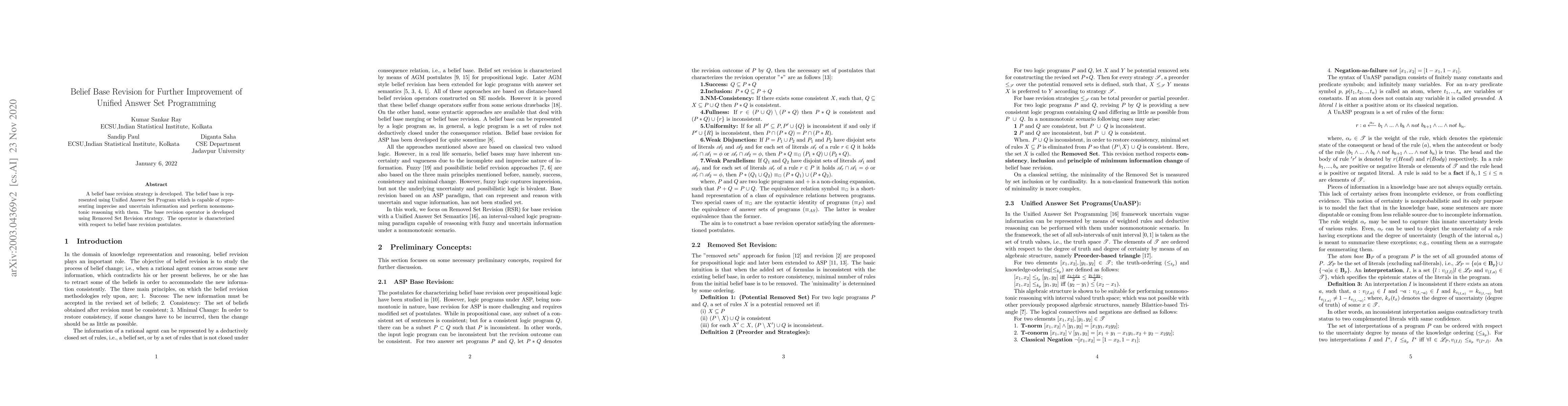 This paper introduces a belief base revision method using Unified Answer Set Programs to handle imprecise and uncertain information, employing a Removed Set Revision strategy that satisfies established postulates for base revision.