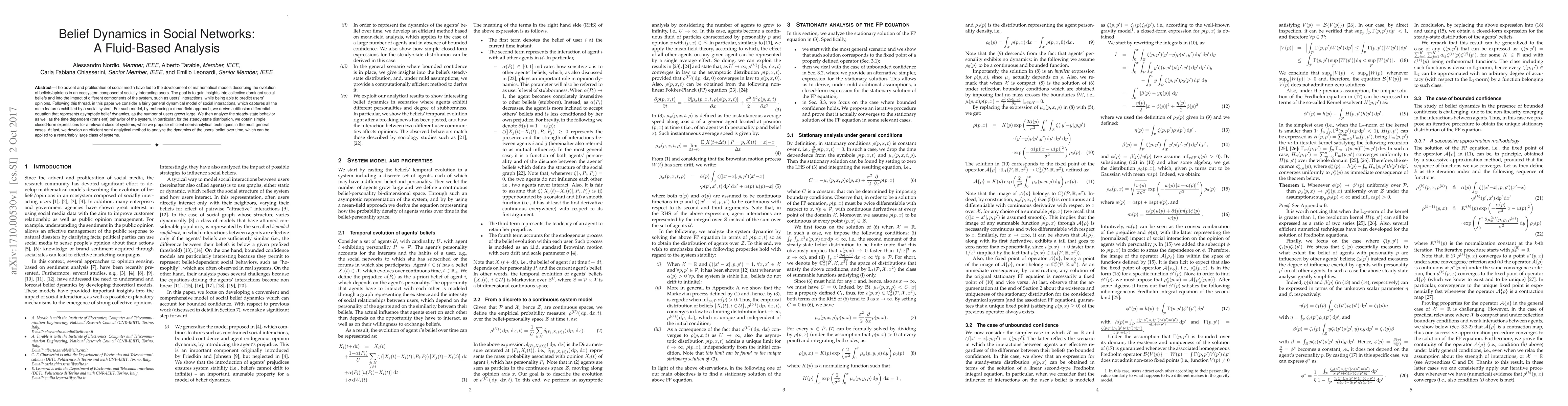 The advent and proliferation of social media have led to the development of mathematical models describing the evolution of beliefs/opinions in an ecosystem composed of socially interacting users. The goal is to gain insights into collective dominant social beliefs and into the impact of different components of the system, such as users' interactions, while being able to predict users' opinions. Following this thread, in this paper we consider a fairly general dynamical model of social interactions, which captures all the main features exhibited by a social system. For such model, by embracing a mean-field approach, we derive a diffusion differential equation that represents asymptotic belief dynamics, as the number of users grows large. We then analyze the steady-state behavior as well as the time dependent (transient) behavior of the system. In particular, for the steady-state distribution, we obtain simple closed-form expressions for a relevant class of systems, while we propose efficient semi-analytical techniques in the most general cases. At last, we develop an efficient semi-analytical method to analyze the dynamics of the users' belief over time, which can be applied to a remarkably large class of systems.