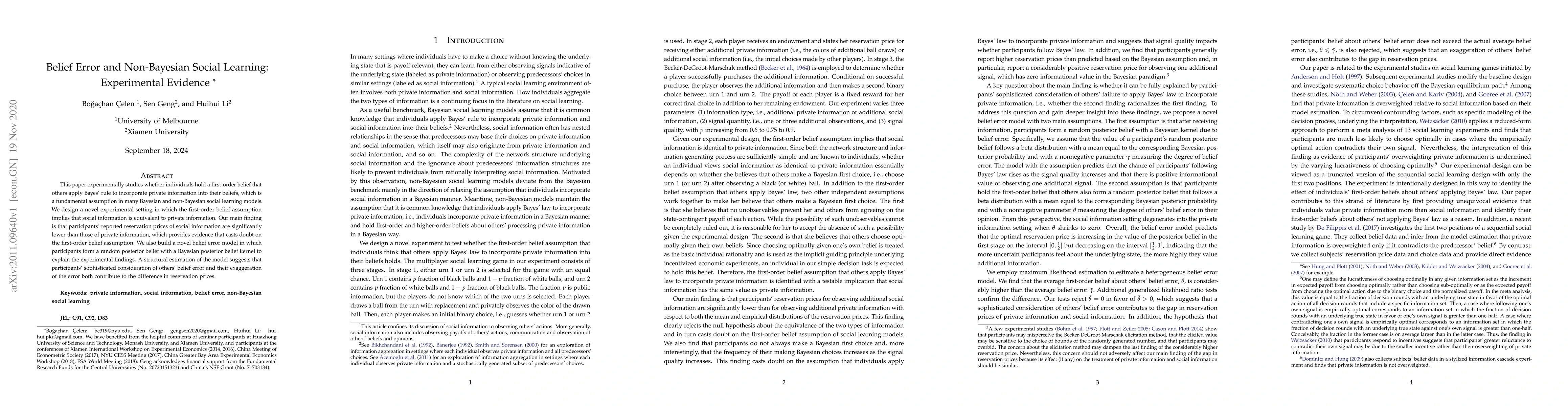 This research distinguishes itself by directly testing the first-order belief assumption and proposing a model that accounts for belief error and its exaggeration in social learning.