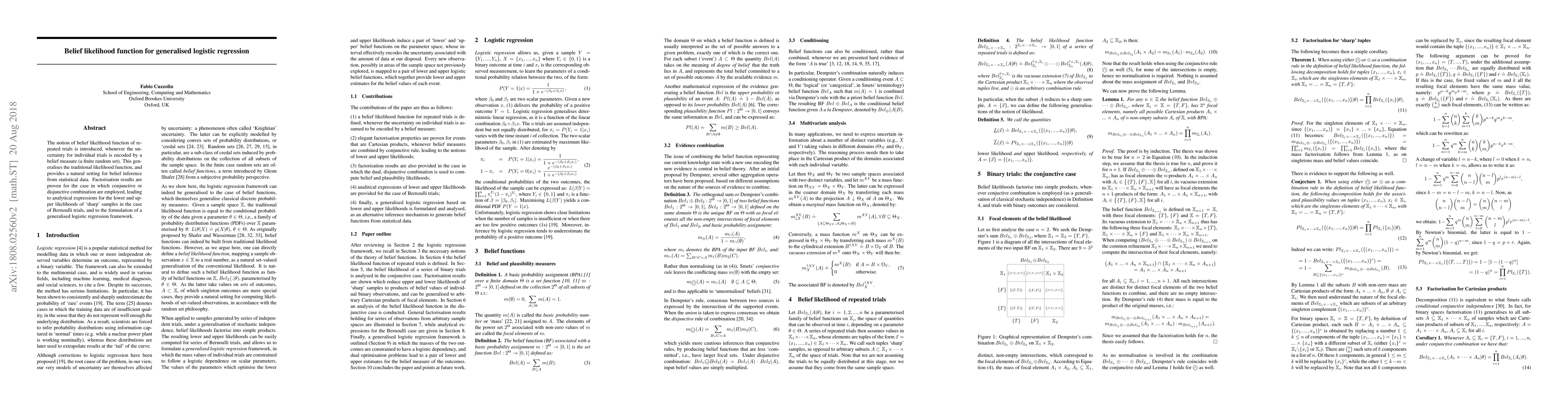 This paper introduces a belief likelihood function for generalised logistic regression, extending traditional likelihood functions to incorporate uncertainty encoded by belief measures. It provides analytical expressions for lower and upper likelihoods in Bernoulli trials and formulates a new generalised logistic regression framework.