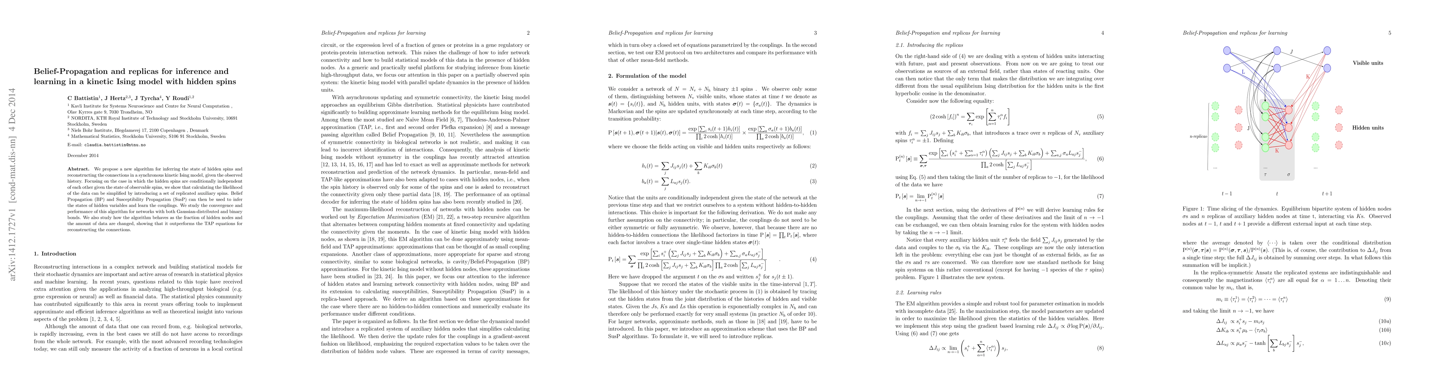This paper proposes a new algorithm using Belief Propagation and Susceptibility Propagation for inferring hidden spins and learning connections in a kinetic Ising model. The method introduces replicated auxiliary spins to simplify likelihood calculations and outperforms the TAP equations in reconstructing connections.