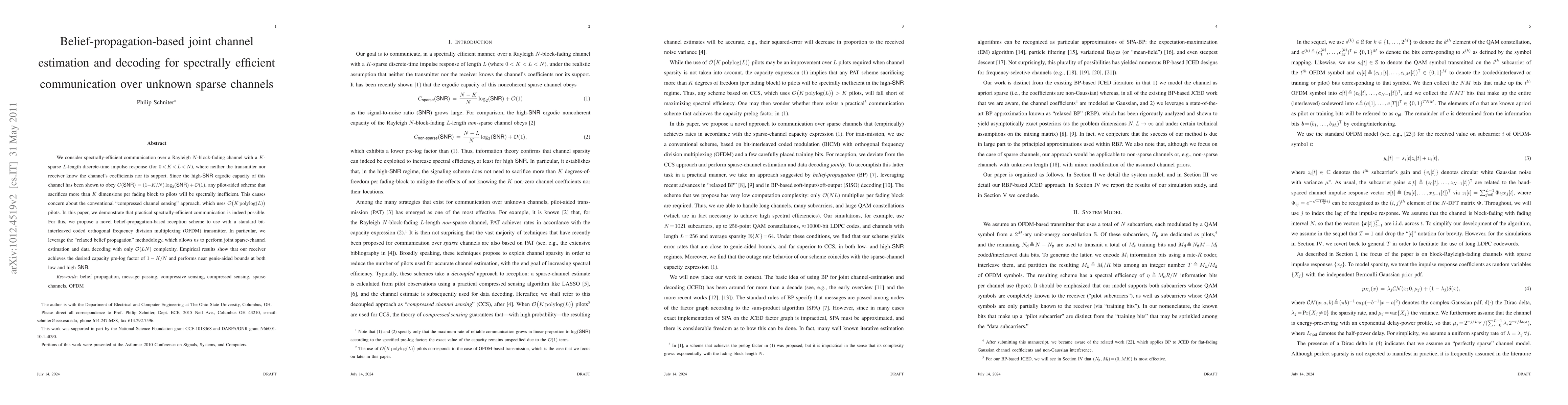 This paper proposes a belief-propagation-based joint channel estimation and decoding scheme for spectrally efficient communication over unknown sparse channels. The approach leverages "relaxed belief propagation" to achieve O(LN) complexity and near optimal performance, demonstrating spectral efficiency without sacrificing more than K dimensions per fading block to pilots.