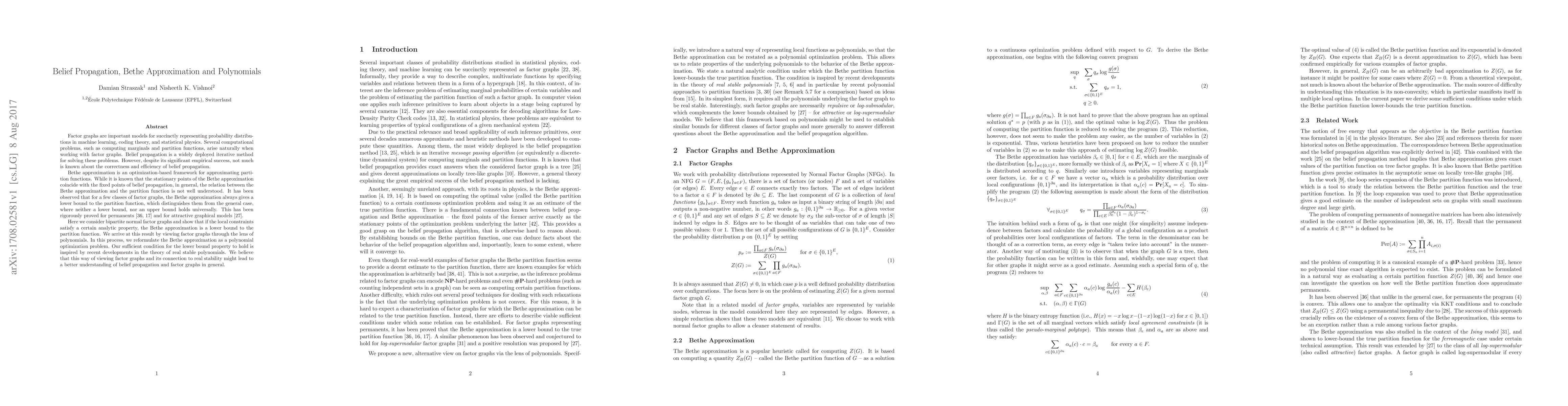This paper investigates the relationship between belief propagation and the Bethe approximation for factor graphs, demonstrating that under certain analytic conditions on local constraints, the Bethe approximation provides a lower bound for the partition function. The authors reformulate the Bethe approximation as a polynomial optimization problem, leveraging recent advances in real stable polynomials to establish their sufficient condition.
