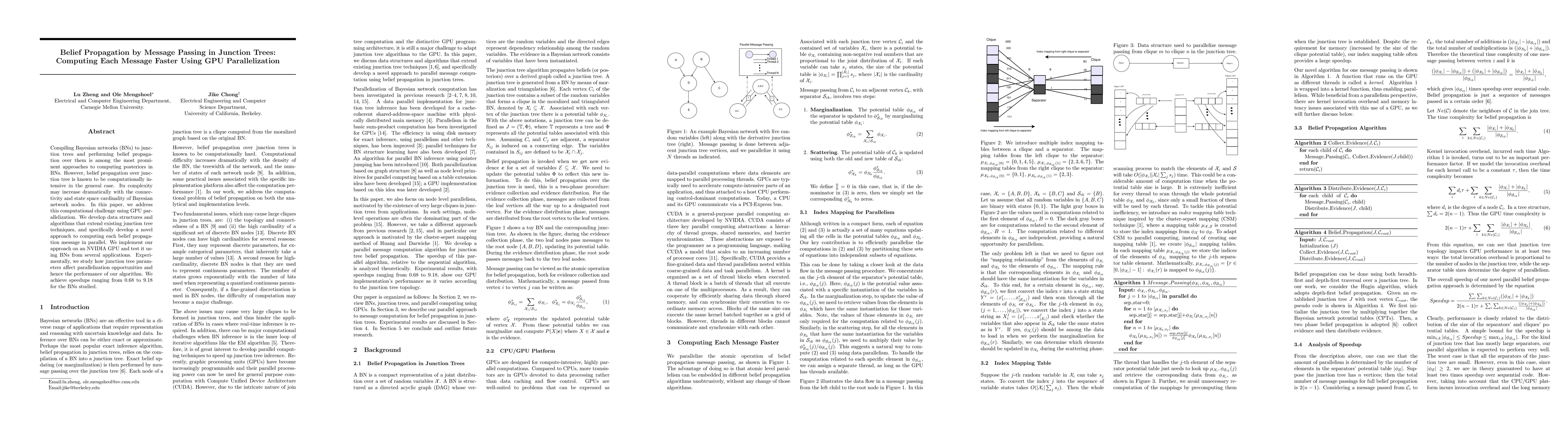 This paper explores GPU parallelization techniques to accelerate belief propagation in junction trees for Bayesian networks, achieving significant speedups ranging from 0.68 to 9.18 times. The authors develop novel algorithms and data structures to compute each message in parallel, demonstrating effective performance improvements across various applications.