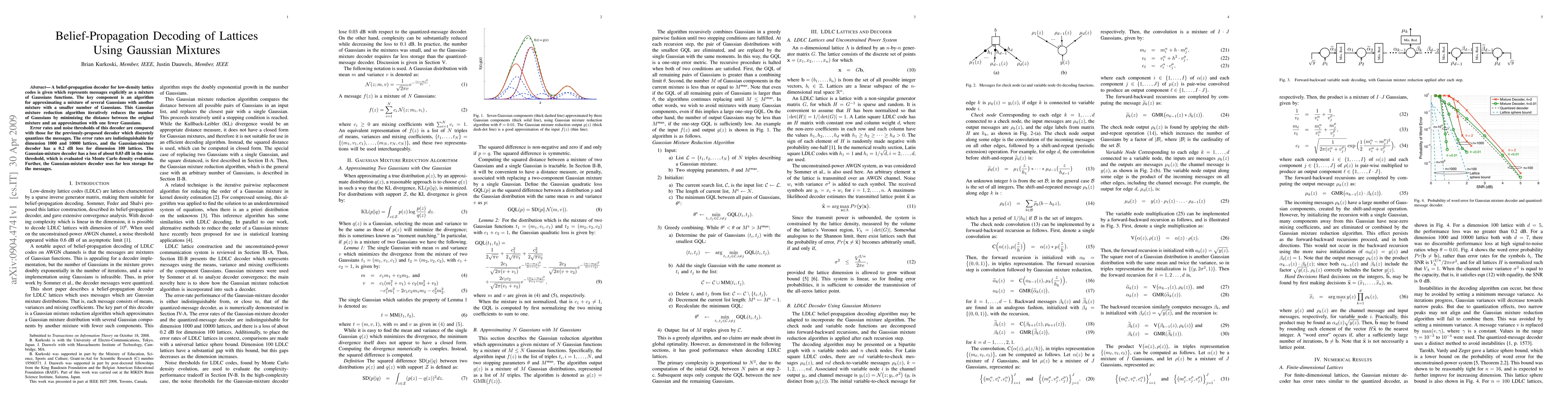A belief-propagation decoder for low-density lattice codes is given which represents messages explicitly as a mixture of Gaussians functions. The key component is an algorithm for approximating a mixture of several Gaussians with another mixture with a smaller number of Gaussians. This Gaussian mixture reduction algorithm iteratively reduces the number of Gaussians by minimizing the distance between the original mixture and an approximation with one fewer Gaussians. Error rates and noise thresholds of this decoder are compared with those for the previously-proposed decoder which discretely quantizes the messages. The error rates are indistinguishable for dimension 1000 and 10000 lattices, and the Gaussian-mixture decoder has a 0.2 dB loss for dimension 100 lattices. The Gaussian-mixture decoder has a loss of about 0.03 dB in the noise threshold, which is evaluated via Monte Carlo density evolution. Further, the Gaussian-mixture decoder uses far less storage for the messages.