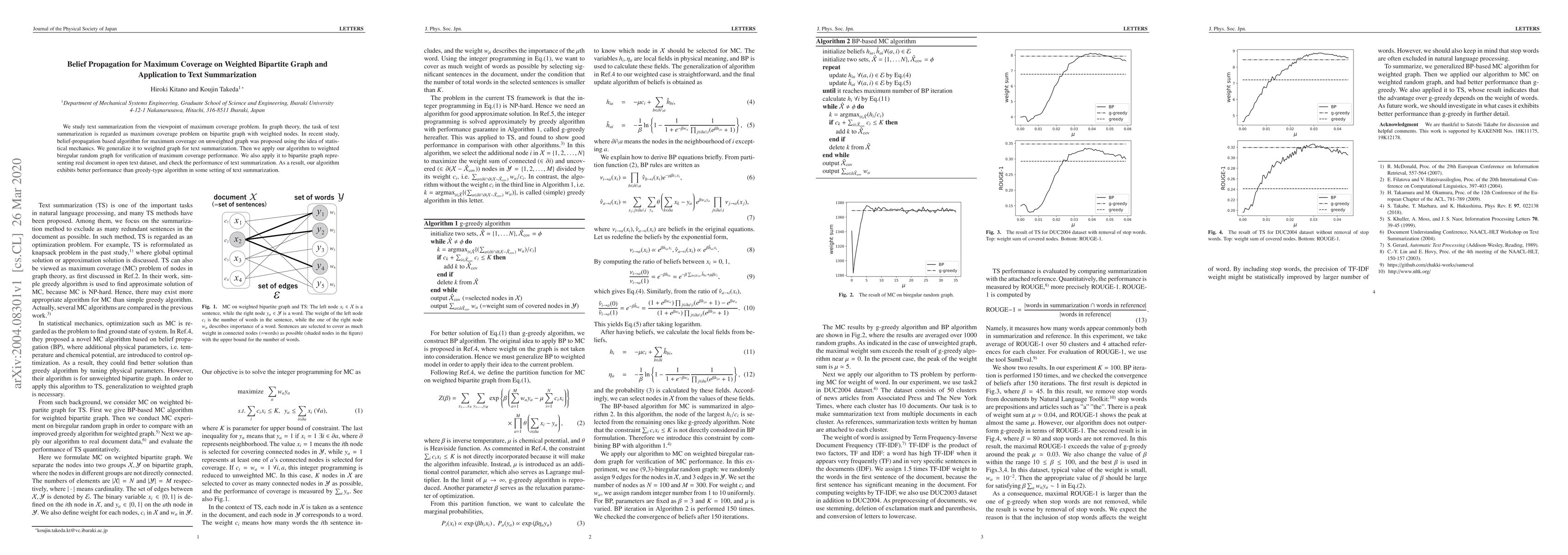 This paper proposes a belief-propagation based algorithm for the maximum coverage problem on weighted bipartite graphs, applying it to text summarization. The algorithm outperforms greedy methods in certain text summarization settings, as demonstrated on both random and real document datasets.
