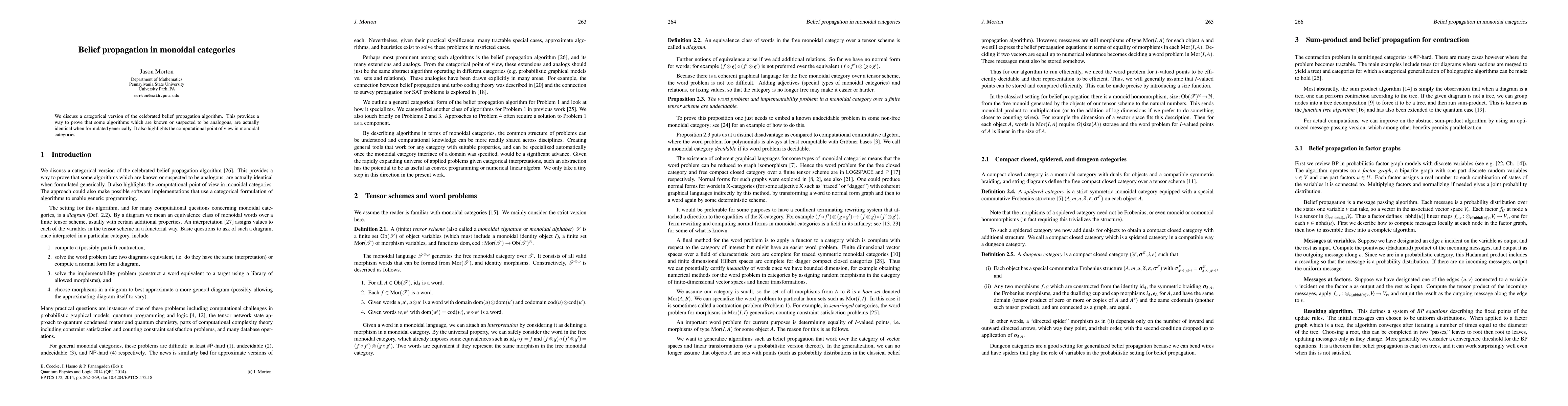 Summary: This paper introduces a categorical version of the belief propagation algorithm, demonstrating its equivalence to known analogous algorithms and emphasizing computational insights within monoidal categories.
