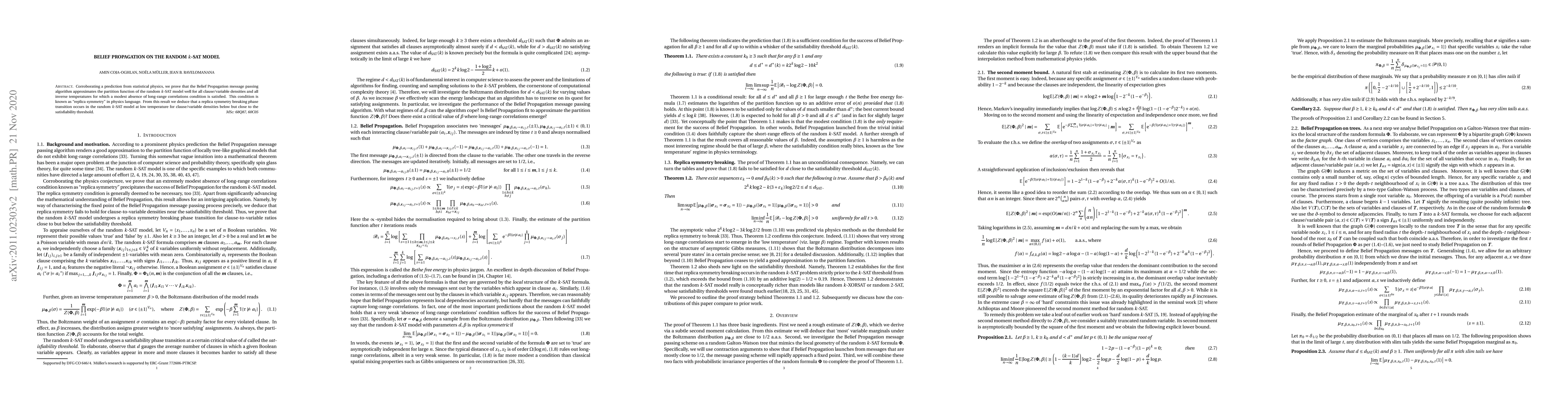 This paper proves that Belief Propagation accurately approximates the partition function of the random $k$-SAT model under certain conditions, indicating a replica symmetry breaking phase transition at low temperatures near the satisfiability threshold. The study corroborates predictions from statistical physics regarding the algorithm's effectiveness.