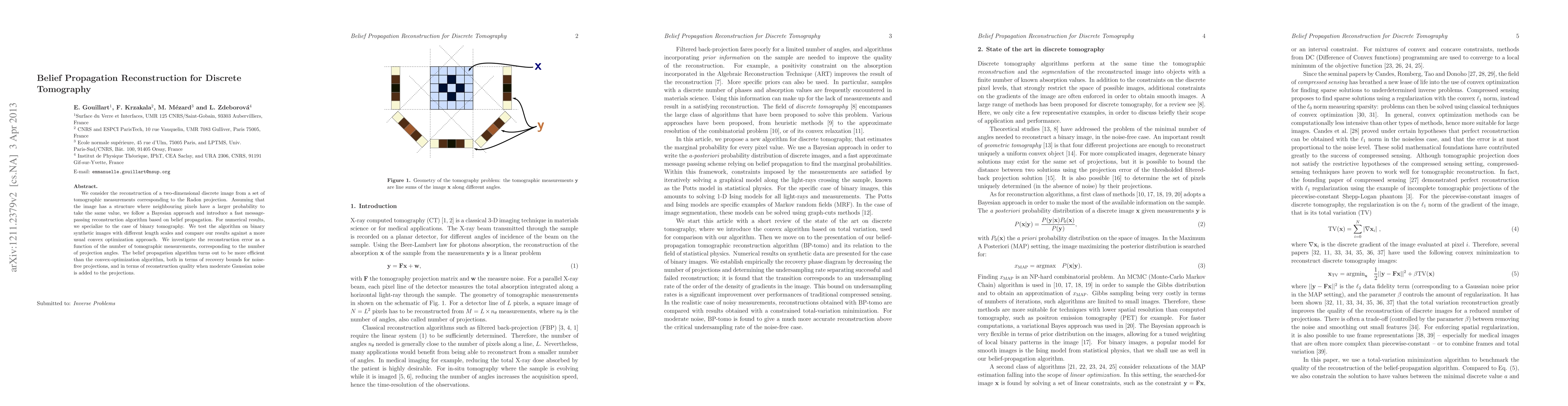 This paper proposes a belief propagation algorithm for reconstructing two-dimensional discrete images from Radon projection data, demonstrating its efficiency through binary tomography tests. The belief propagation method outperforms a convex optimization approach in both noise-free recovery and reconstruction quality under moderate Gaussian noise.