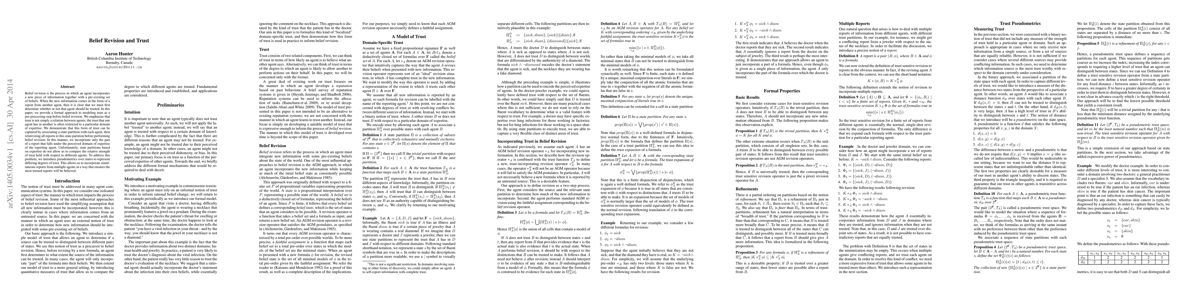 The paper presents a formal approach to modeling trust as a pre-processing step before belief revision, using state-partitions to indicate domains of expertise and pseudometrics to quantify trust strength.