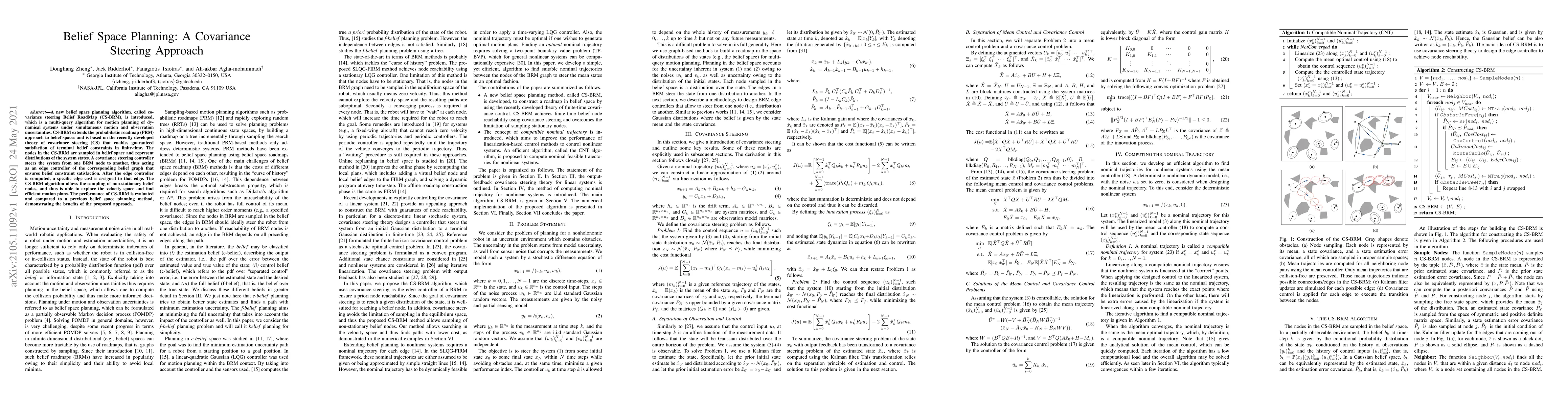 The paper introduces a new belief space planning algorithm called covariance steering Belief RoadMap (CS-BRM) for motion planning under uncertainty, extending probabilistic roadmaps to belief spaces and ensuring satisfaction of terminal belief constraints. CS-BRM employs a covariance steering controller for efficient exploration of velocity space and outperforms previous methods.
