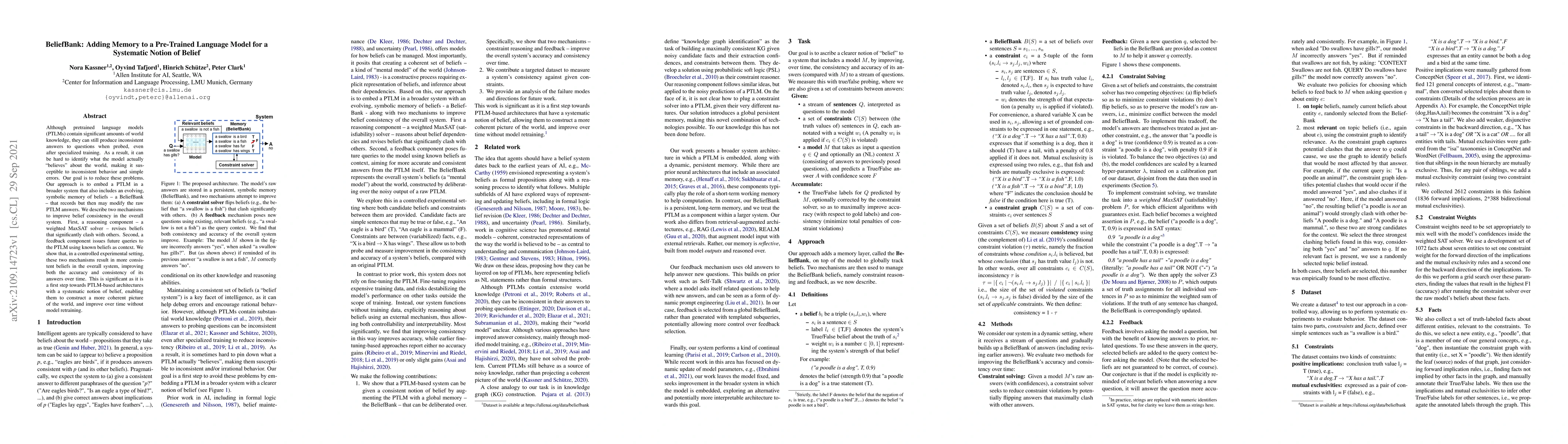 Although pretrained language models (PTLMs) contain significant amounts of world knowledge, they can still produce inconsistent answers to questions when probed, even after specialized training. As a result, it can be hard to identify what the model actually "believes" about the world, making it susceptible to inconsistent behavior and simple errors. Our goal is to reduce these problems. Our approach is to embed a PTLM in a broader system that also includes an evolving, symbolic memory of beliefs -- a BeliefBank -- that records but then may modify the raw PTLM answers. We describe two mechanisms to improve belief consistency in the overall system. First, a reasoning component -- a weighted MaxSAT solver -- revises beliefs that significantly clash with others. Second, a feedback component issues future queries to the PTLM using known beliefs as context. We show that, in a controlled experimental setting, these two mechanisms result in more consistent beliefs in the overall system, improving both the accuracy and consistency of its answers over time. This is significant as it is a first step towards PTLM-based architectures with a systematic notion of belief, enabling them to construct a more coherent picture of the world, and improve over time without model retraining.
