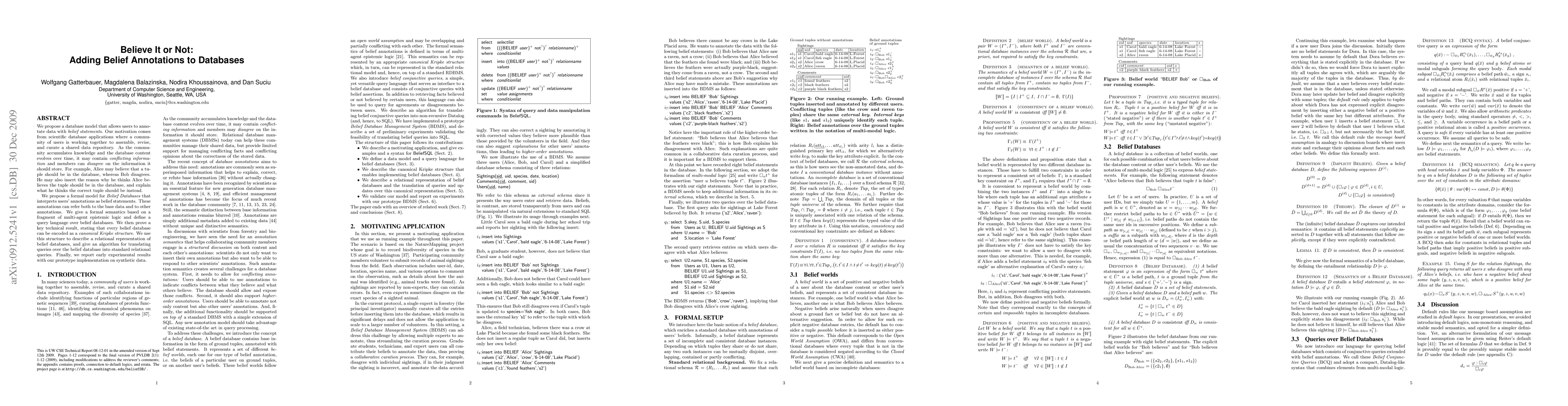 Researchers developed a database model to annotate data with belief statements, enabling multiple users to collaborate on assembling and curating shared data repositories. The model allows for formal representation of beliefs and provides a way to translate queries over the annotated database into standard relational queries.