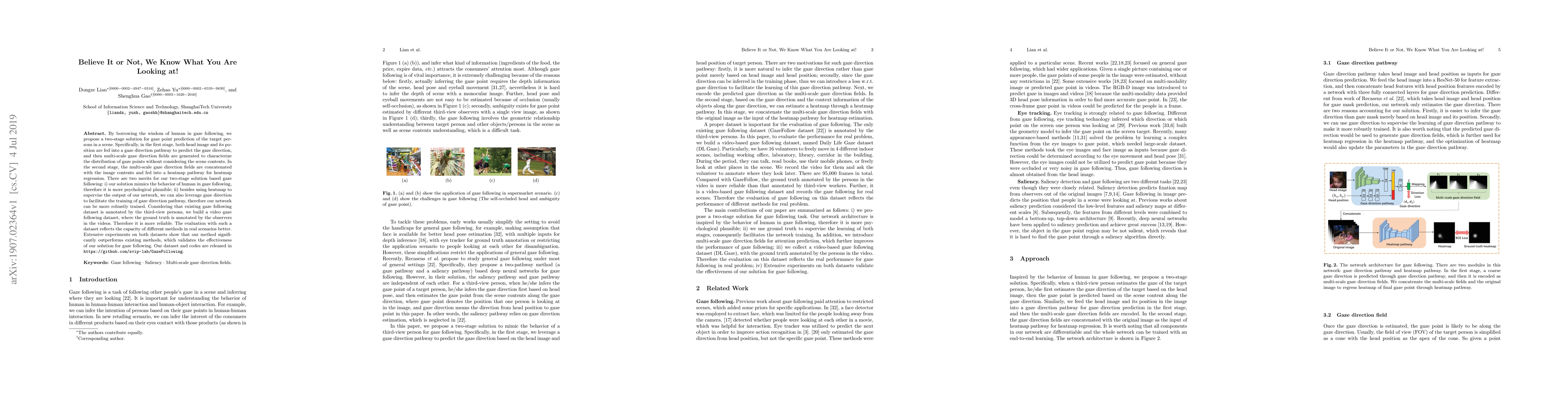 By borrowing the wisdom of human in gaze following, we propose a two-stage solution for gaze point prediction of the target persons in a scene. Specifically, in the first stage, both head image and its position are fed into a gaze direction pathway to predict the gaze direction, and then multi-scale gaze direction fields are generated to characterize the distribution of gaze points without considering the scene contents. In the second stage, the multi-scale gaze direction fields are concatenated with the image contents and fed into a heatmap pathway for heatmap regression. There are two merits for our two-stage solution based gaze following: i) our solution mimics the behavior of human in gaze following, therefore it is more psychological plausible; ii) besides using heatmap to supervise the output of our network, we can also leverage gaze direction to facilitate the training of gaze direction pathway, therefore our network can be more robustly trained. Considering that existing gaze following dataset is annotated by the third-view persons, we build a video gaze following dataset, where the ground truth is annotated by the observers in the videos. Therefore it is more reliable. The evaluation with such a dataset reflects the capacity of different methods in real scenarios better. Extensive experiments on both datasets show that our method significantly outperforms existing methods, which validates the effectiveness of our solution for gaze following. Our dataset and codes are released in https://github.com/svip-lab/GazeFollowing.