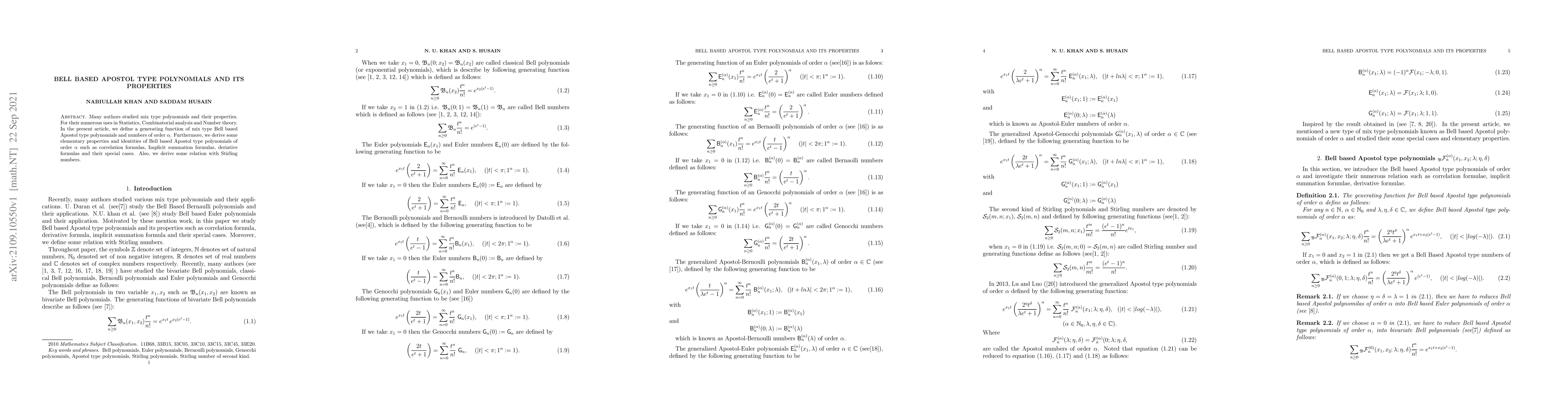 This paper defines a generating function for Bell based Apostol type polynomials and derives properties such as correlation formulas and relations with Stirling numbers, expanding the study of mix type polynomials in Statistics, Combinatorial analysis and Number theory.