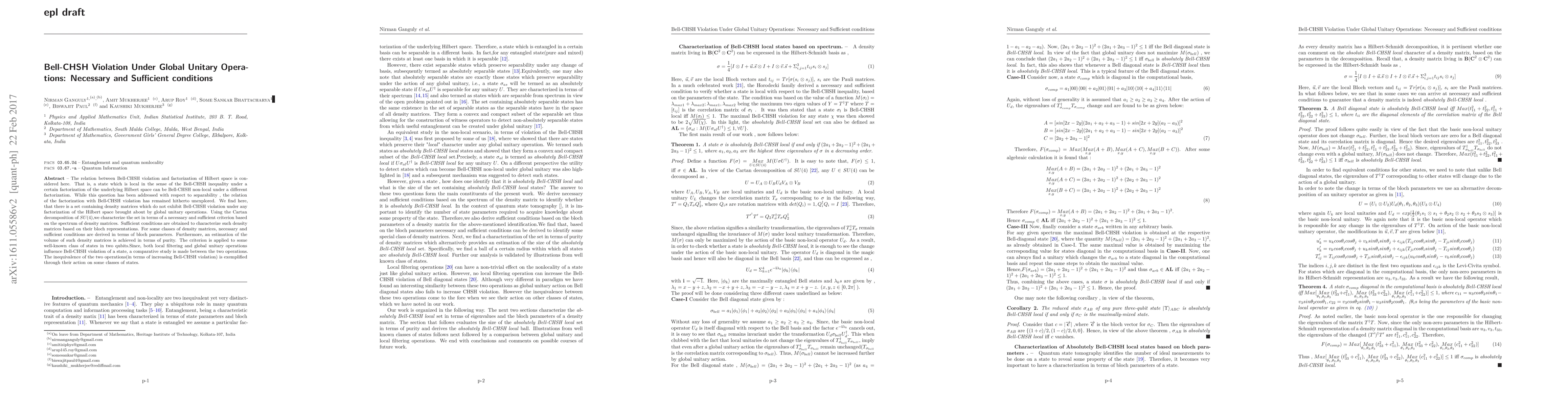 This paper explores the connection between Bell-CHSH inequality violations and the factorization of Hilbert space under global unitary operations. It introduces necessary and sufficient conditions for density matrices that do not violate Bell-CHSH inequalities regardless of the factorization, characterized via the spectrum and Bloch representations, and demonstrates their inequivalence with local filtering.