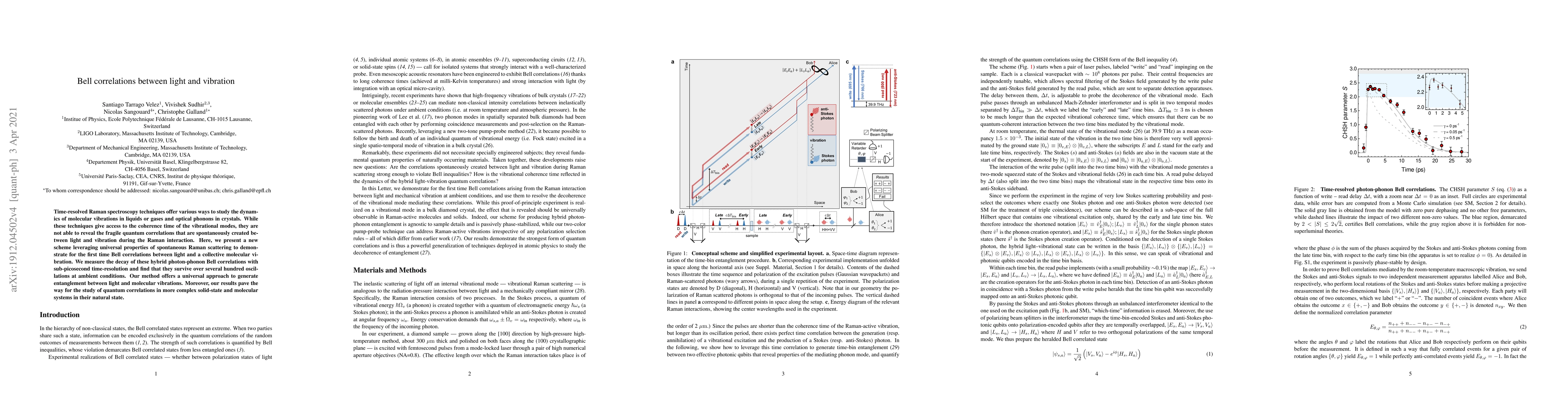 Time-resolved Raman spectroscopy techniques offer various ways to study the dynamics of molecular vibrations in liquids or gases and optical phonons in crystals. While these techniques give access to the coherence time of the vibrational modes, they are not able to reveal the fragile quantum correlations that are spontaneously created between light and vibration during the Raman interaction. Here, we present a scheme leveraging universal properties of spontaneous Raman scattering to demonstrate Bell correlations between light and a collective molecular vibration. We measure the decay of these hybrid photon-phonon Bell correlations with sub-picosecond time resolution and find that they survive over several hundred oscillations at ambient conditions. Our method offers a universal approach to generate entanglement between light and molecular vibrations. Moreover, our results pave the way for the study of quantum correlations in more complex solid-state and molecular systems in their natural state.